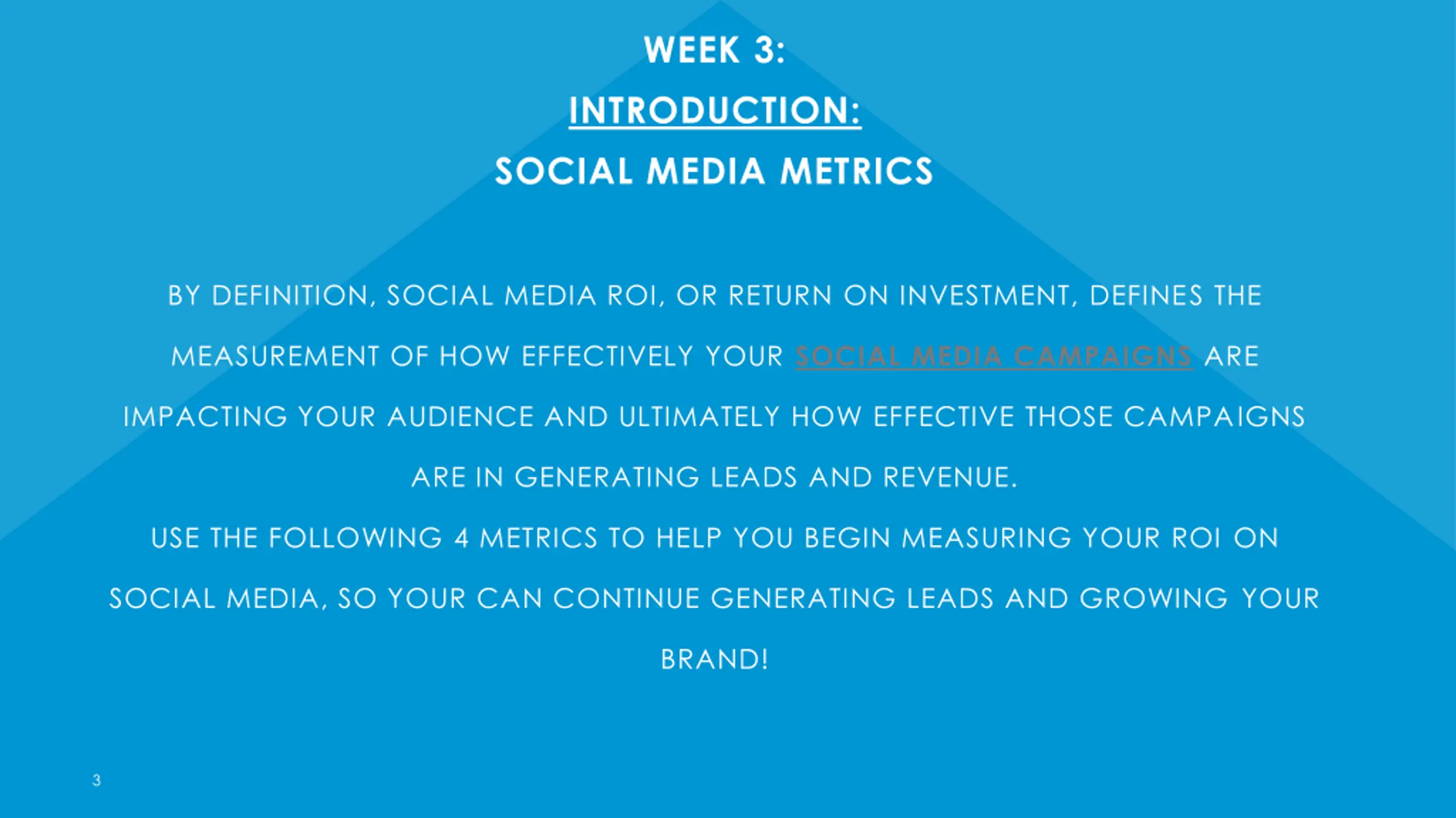 WEEK 3: INTRODUCTION: SOCIAL MEDIA METRICS BY DEFINITION, SOCIAL MEDIA ROI, OR RETURN ON INVESTMENT, DEFINES THE MEASUREMENT OF HOW EFFECTIVELY YOUR SOCIAL MEDIA CAMPAIGNS ARE IMPACTING YOUR AUDIENCE AND ULTIMATELY HOW EFFECTIVE THOSE CAMPAIGNS ARE IN GENERATING LEADS AND REVENUE. USE THE FOLLOWING 4 METRICS TO HELP YOU BEGIN MEASURING YOUR ROI ON SOCIAL MEDIA, SO YOUR CAN CONTINUE GENERATING LEADS AND GROWING YOUR BRAND! 3