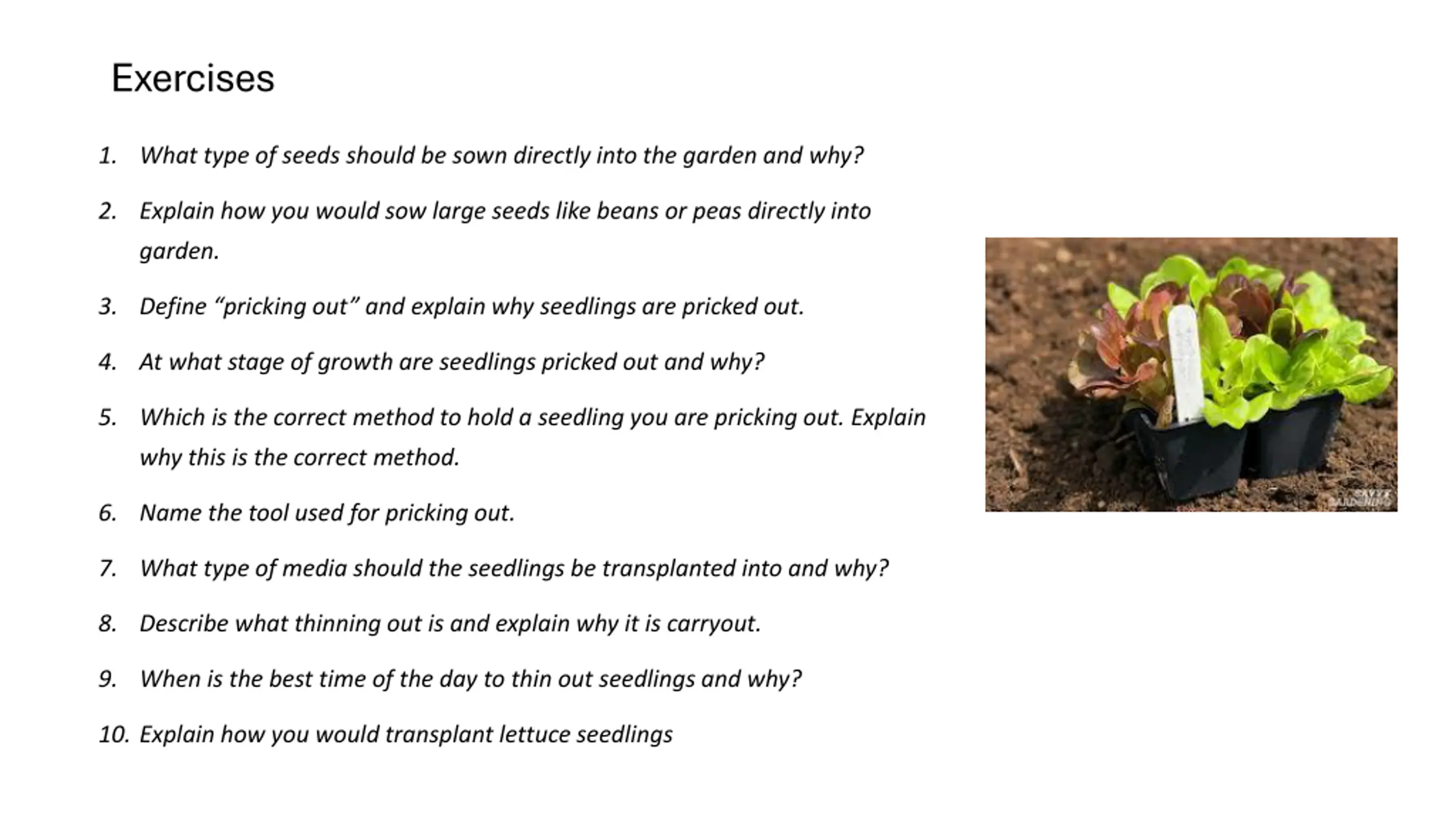 Exercises 1. What type of seeds should be sown directly into the garden and why? 2. Explain how you would sow large seeds like beans or peas directly into garden. 3. Define pricking out and explain why seedlings are pricked out. 4. At what stage of growth are seedlings pricked out and why? 5. Which is the correct method to hold a seedling you are pricking out. Explain why this is the correct method. 6. Name the tool used for pricking out. 7. What type of media should the seedlings be transplanted into and why? 8. Describe what thinning out is and explain why it is carryout. 9. When is the best time of the day to thin out seedlings and why? 10. Explain how you would transplant lettuce seedlings