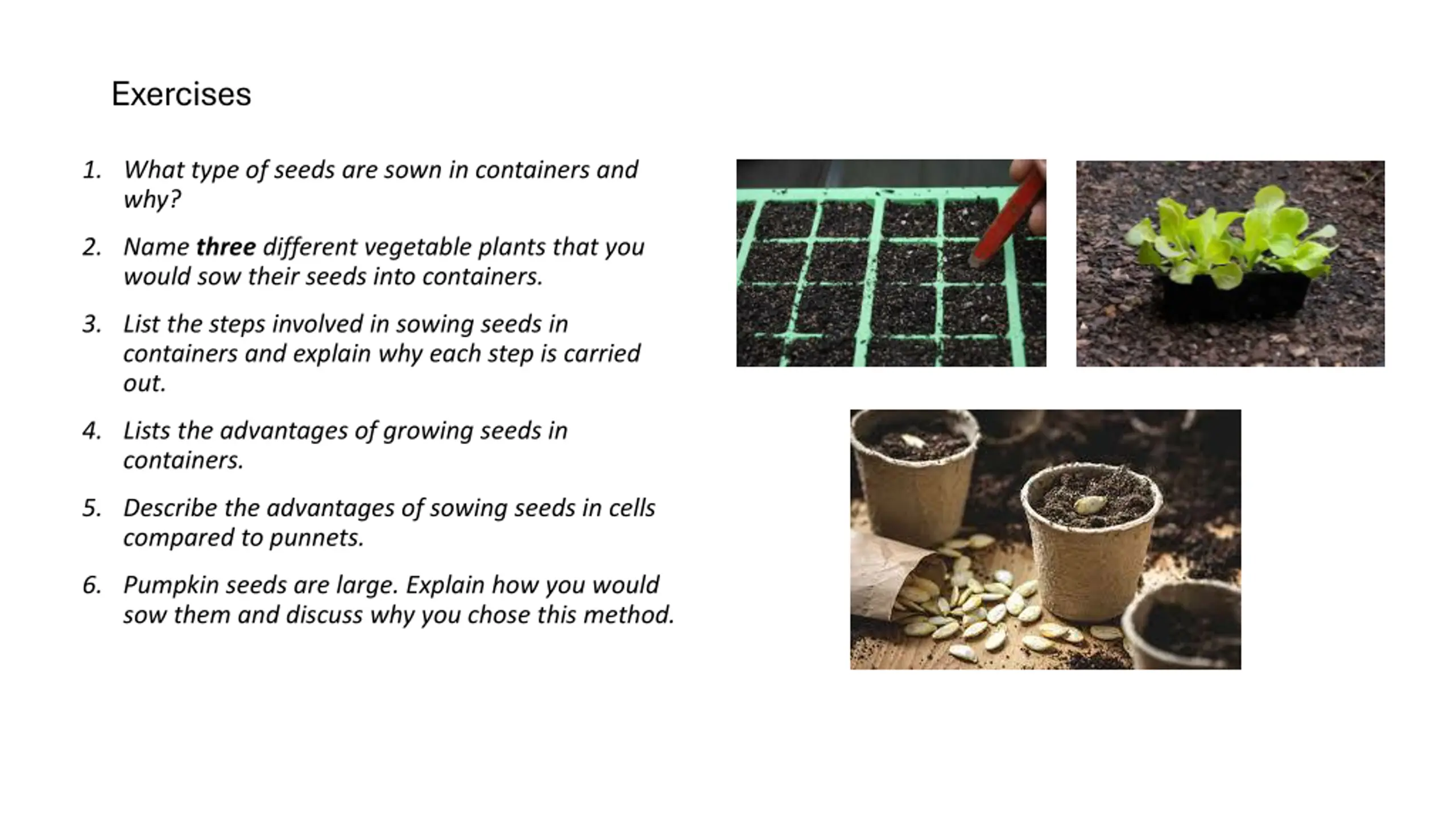 Exercises 1. What type of seeds are sown in containers and why? 2. Name three different vegetable plants that you would sow their seeds into containers. 3. List the steps involved in sowing seeds in containers and explain why each step is carried out. 4. Lists the advantages of growing seeds in containers. 5. Describe the advantages of sowing seeds in cells compared to punnets. 6. Pumpkin seeds are large. Explain how you would sow them and discuss why you chose this method.