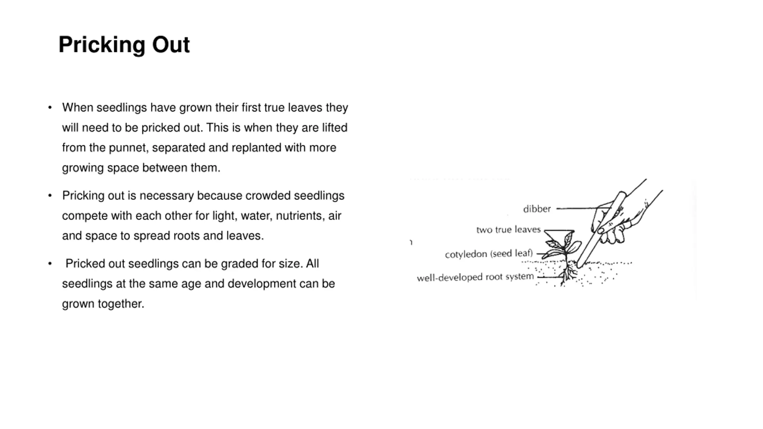 Pricking Out When seedlings have grown their first true leaves they will need to be pricked out. This is when they are lifted from the punnet, separated and replanted with more growing space between them. Pricking out is necessary because crowded seedlings compete with each other for light, water, nutrients, air and space to spread roots and leaves. Pricked out seedlings can be graded for size. All seedlings at the same age and development can be grown together.