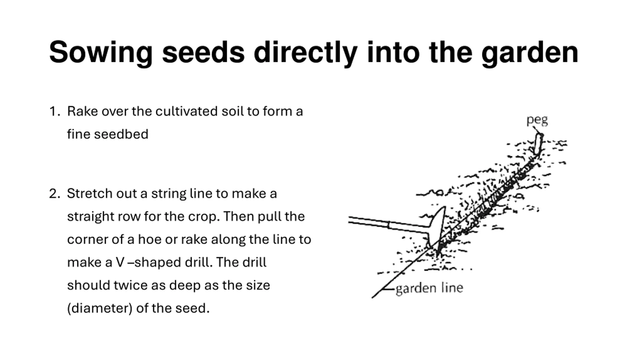 Sowing seeds directly into the garden 1. Rake over the cultivated soil to form a fine seedbed 2. Stretch out a string line to make a straight row for the crop. Then pull the corner of a hoe or rake along the line to make a V shaped drill. The drill should twice as deep as the size (diameter) of the seed.
