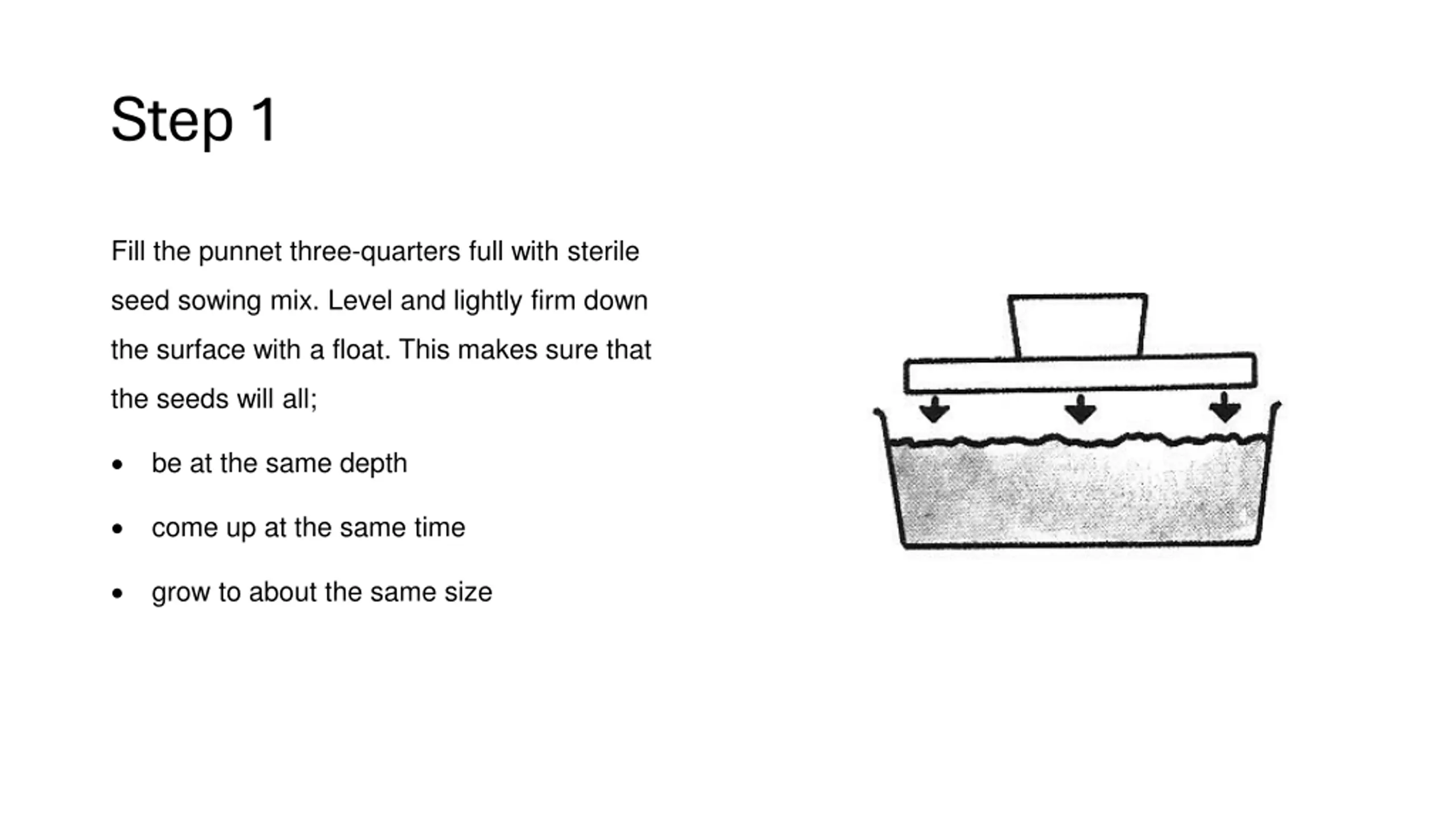 Step 1 Fill the punnet three-quarters full with sterile seed sowing mix. Level and lightly firm down the surface with a float. This makes sure that the seeds will all; be at the same depth come up at the same time grow to about the same size