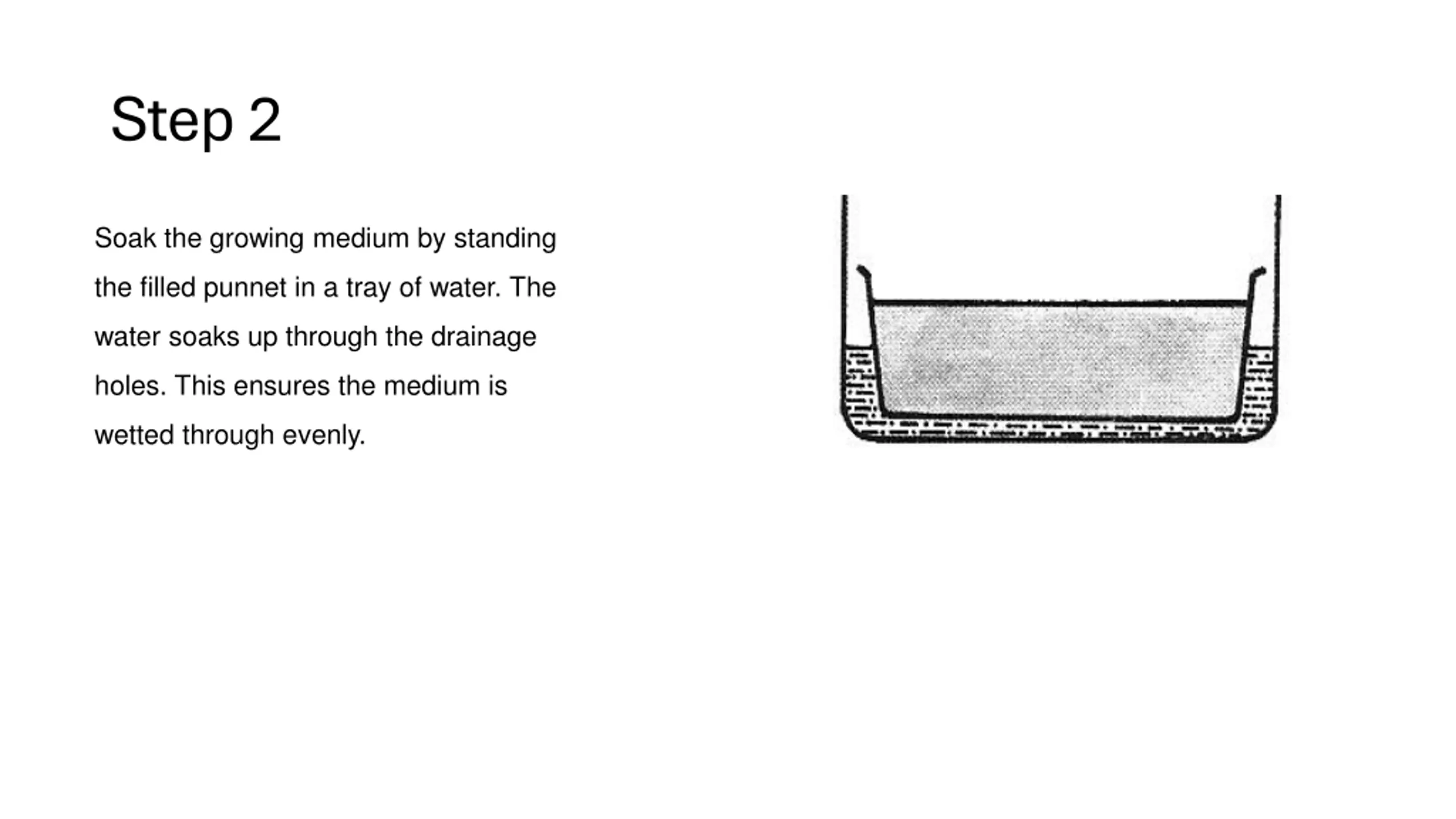 Step 2 Soak the growing medium by standing the filled punnet in a tray of water. The water soaks up through the drainage holes. This ensures the medium is wetted through evenly.