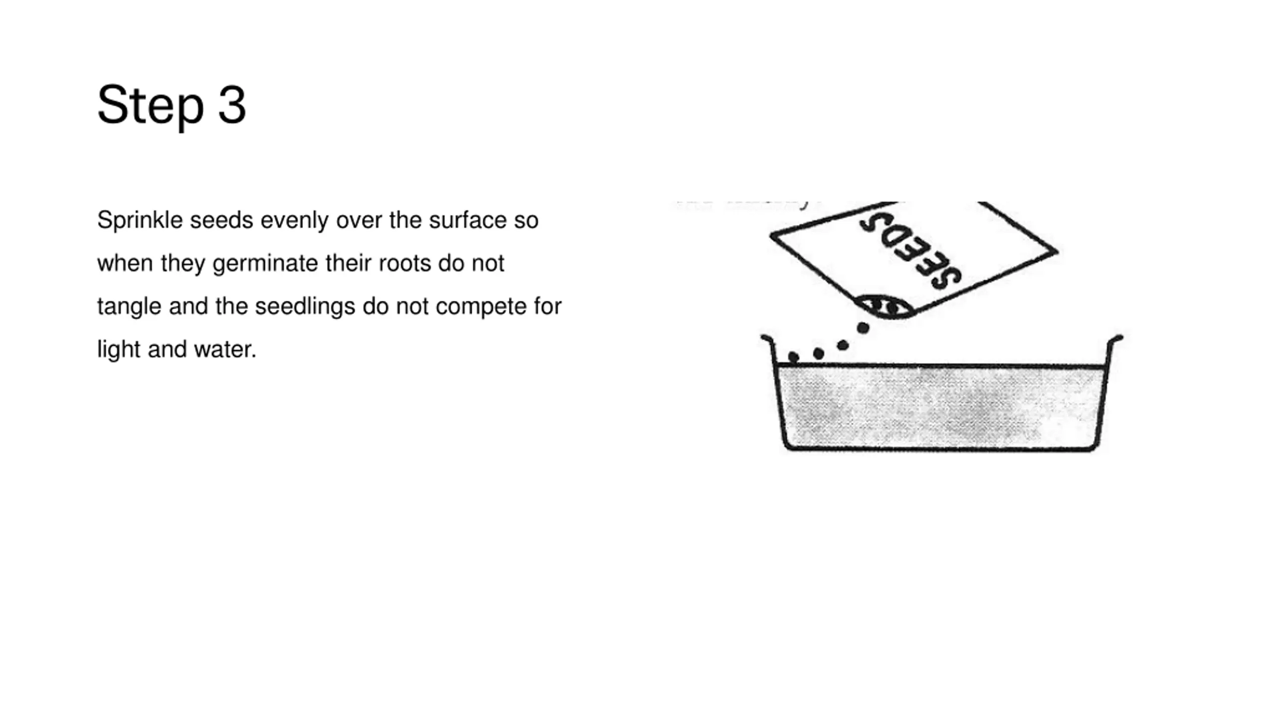 Step 3 Sprinkle seeds evenly over the surface so when they germinate their roots do not tangle and the seedlings do not compete for light and water.
