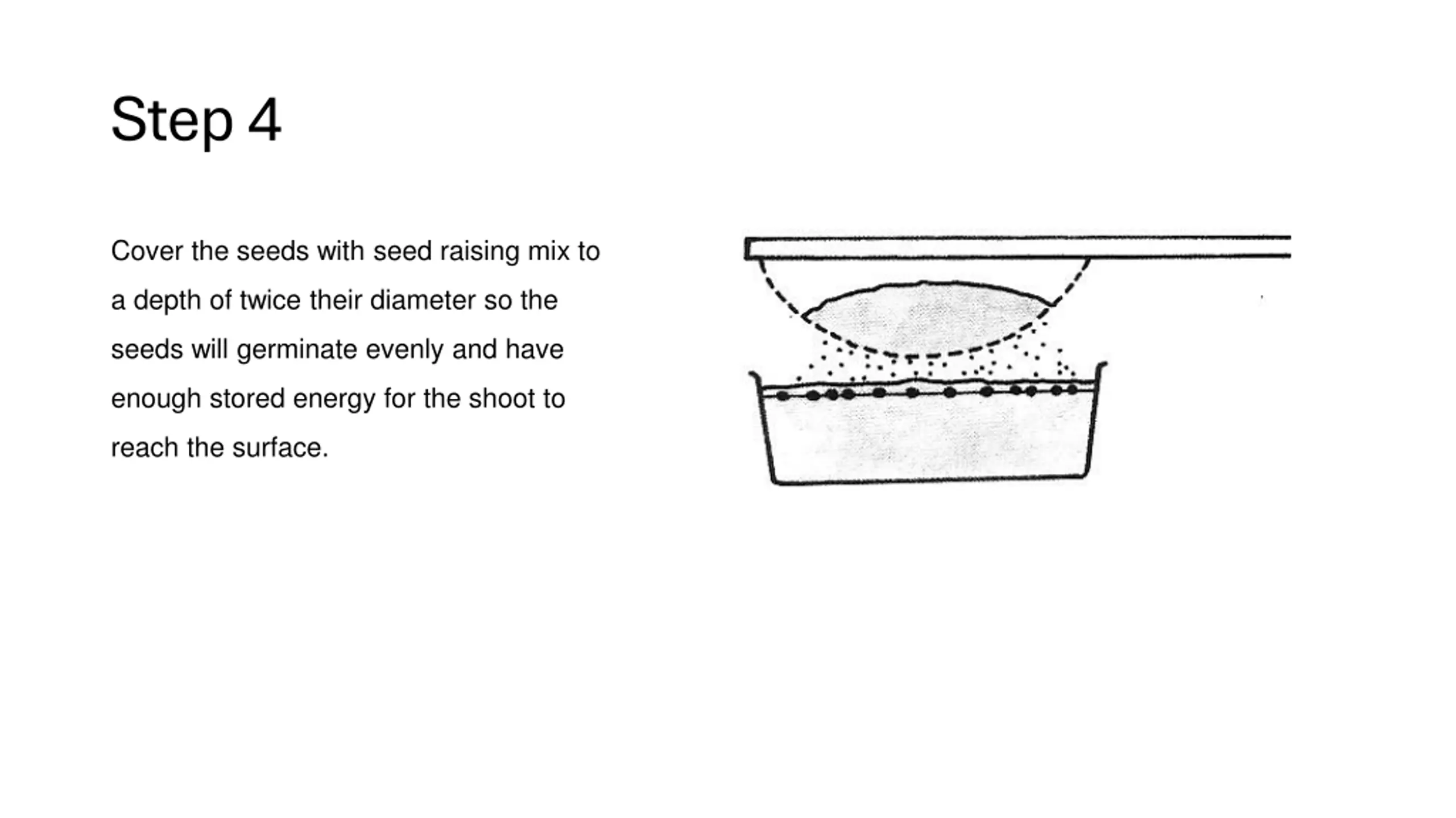 Step 4 Cover the seeds with seed raising mix to a depth of twice their diameter so the seeds will germinate evenly and have enough stored energy for the shoot to reach the surface.