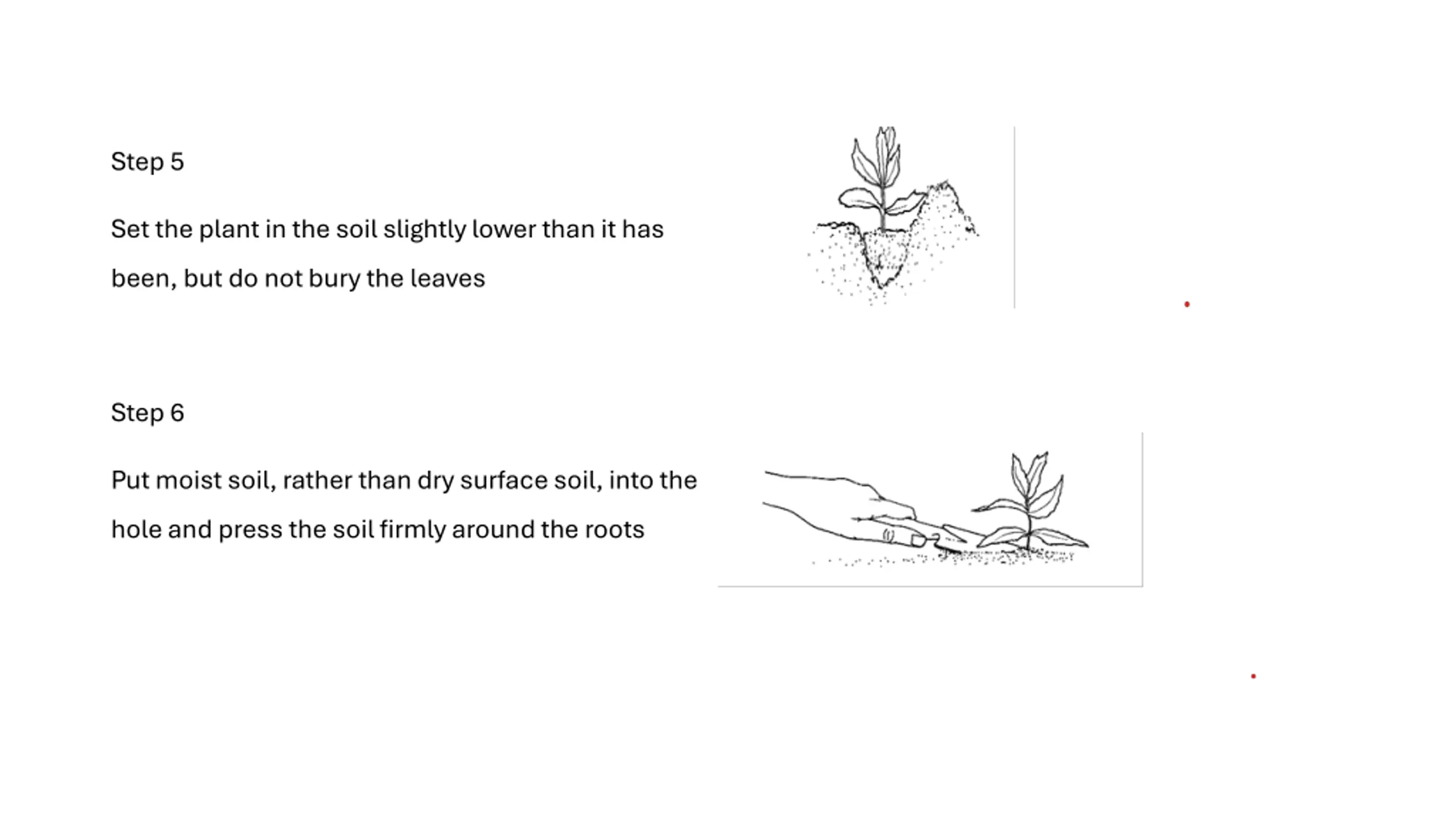 Step 5 Set the plant in the soil slightly lower than it has been, but do not bury the leaves Step 6 Put moist soil, rather than dry surface soil, into the hole and press the soil firmly around the roots