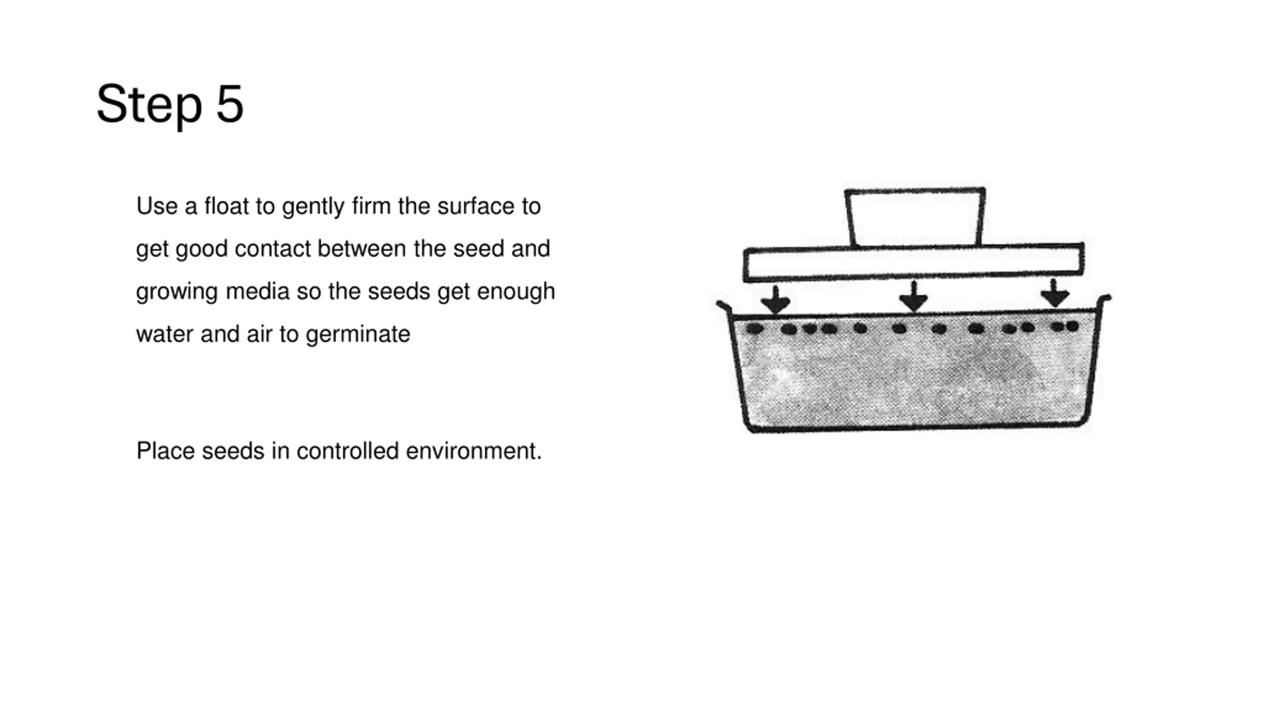 Step 5 Use a float to gently firm the surface to get good contact between the seed and growing media so the seeds get enough water and air to germinate Place seeds in controlled environment.