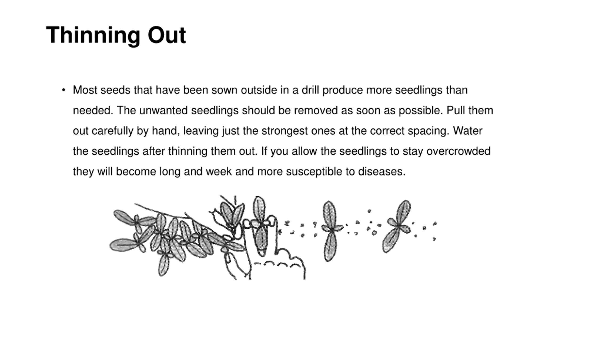 Thinning Out Most seeds that have been sown outside in a drill produce more seedlings than needed. The unwanted seedlings should be removed as soon as possible. Pull them out carefully by hand, leaving just the strongest ones at the correct spacing. Water the seedlings after thinning them out. If you allow the seedlings to stay overcrowded they will become long and week and more susceptible to diseases.