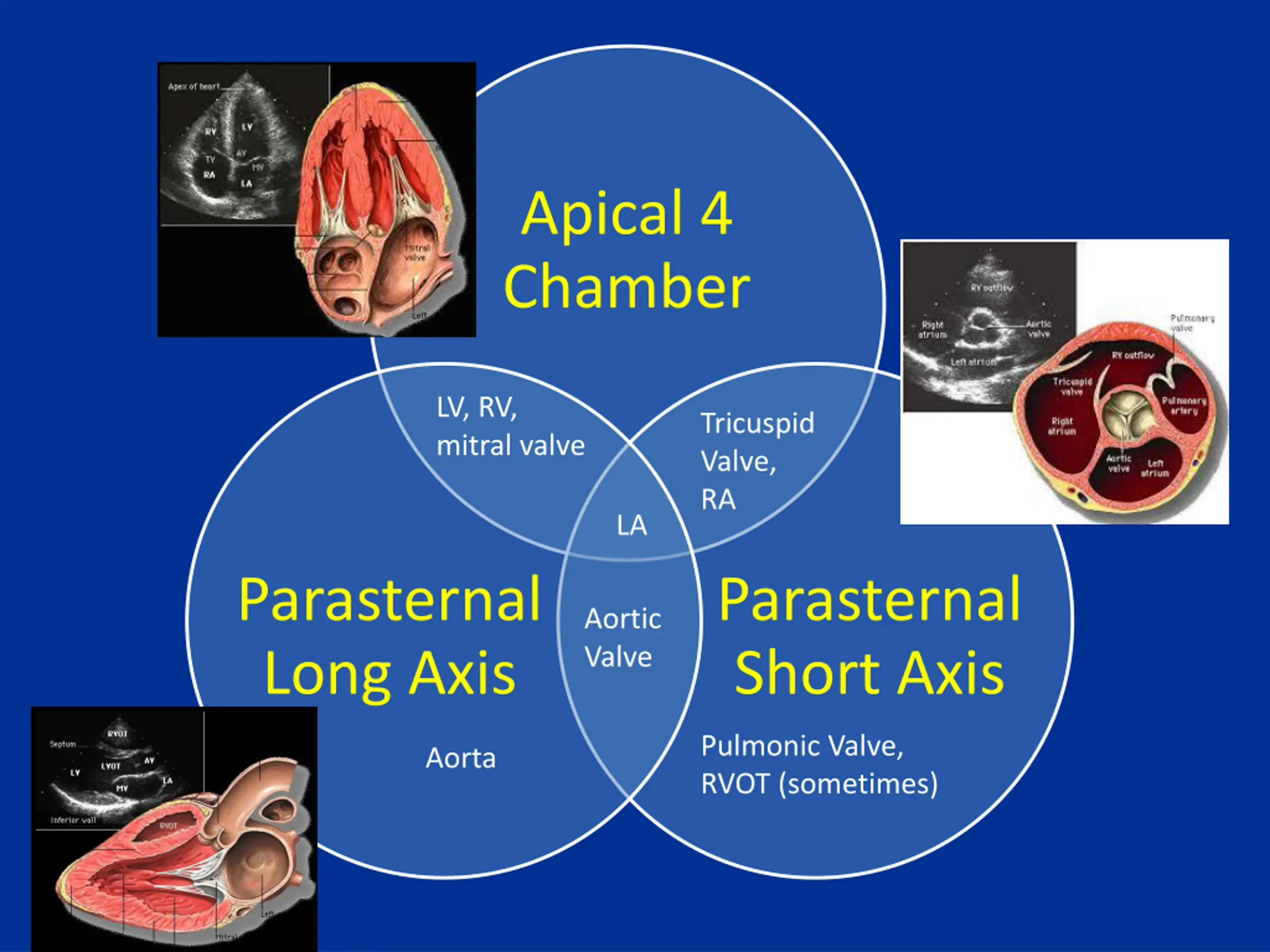 Apical 4 Chamber LV, RV, mitral valve Tricuspid Valve, RA LA Parasternal Long Axis Parasternal Short Axis Aortic Valve Pulmonic Valve, RVOT (sometimes) Aorta