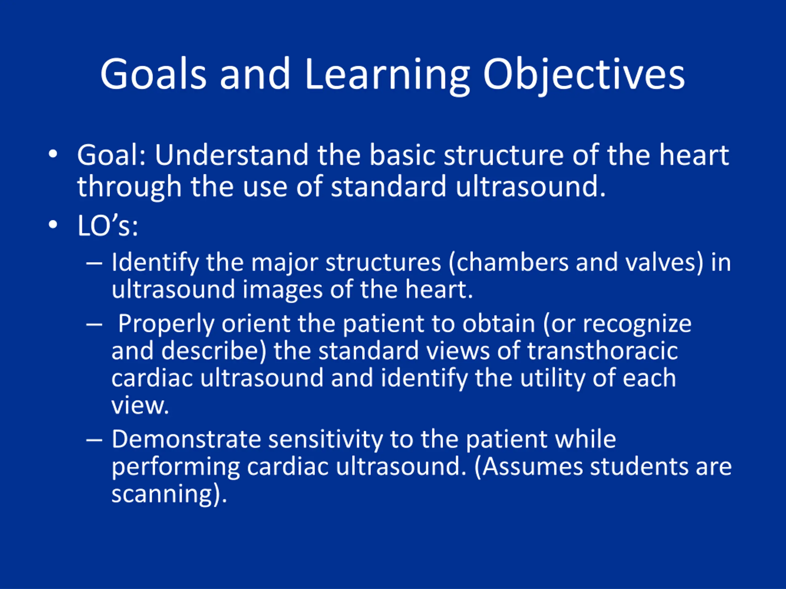 Goals and Learning Objectives Goal: Understand the basic structure of the heart through the use of standard ultrasound. LO s: Identify the major structures (chambers and valves) in ultrasound images of the heart. Properly orient the patient to obtain (or recognize and describe) the standard views of transthoracic cardiac ultrasound and identify the utility of each view. Demonstrate sensitivity to the patient while performing cardiac ultrasound. (Assumes students are scanning).