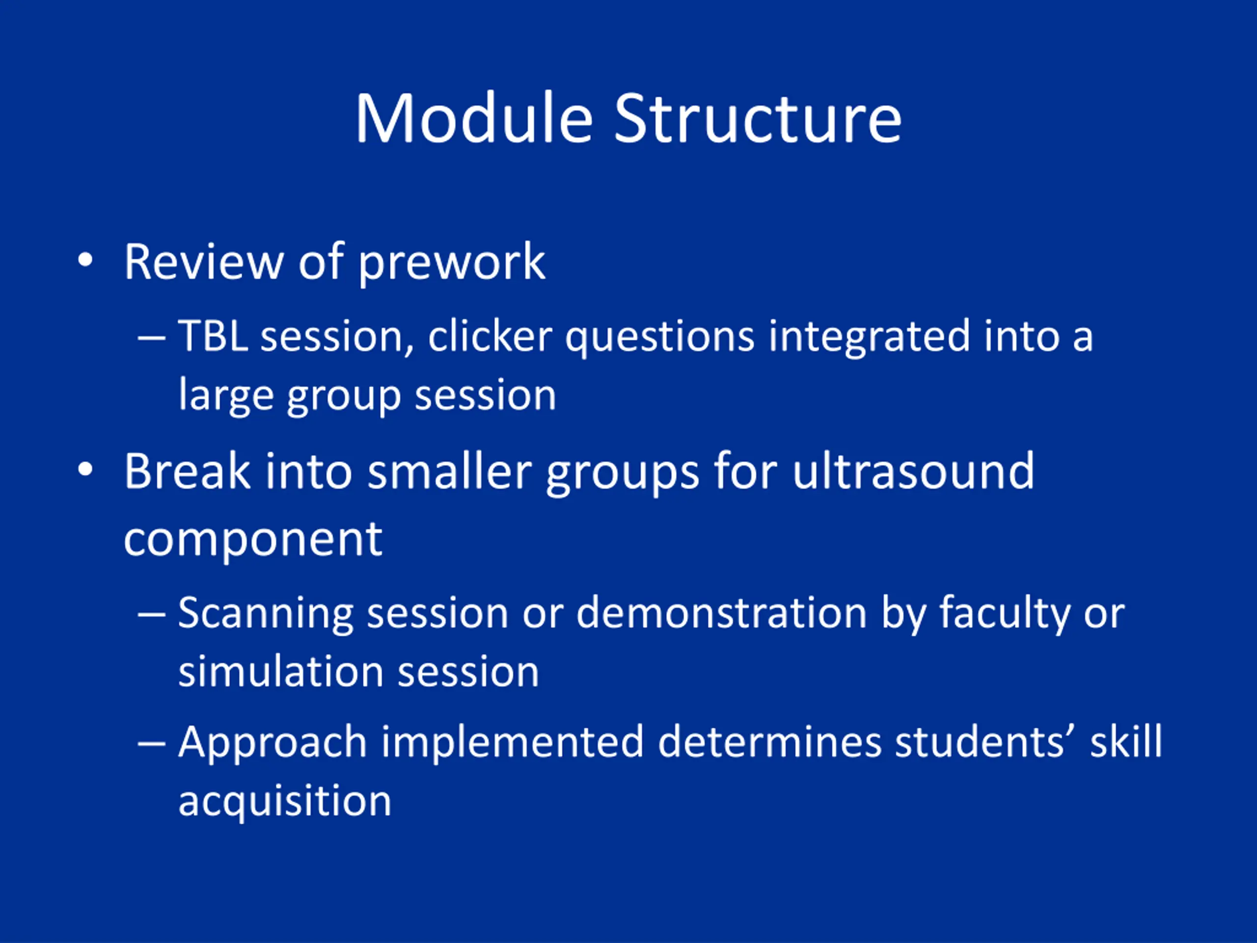 Module Structure Review of prework TBL session, clicker questions integrated into a large group session Break into smaller groups for ultrasound component Scanning session or demonstration by faculty or simulation session Approach implemented determines students skill acquisition