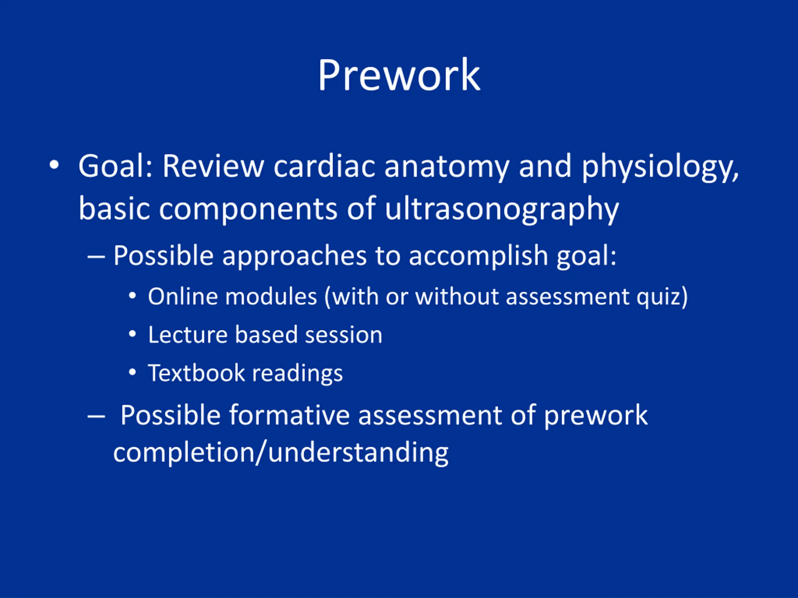Prework Goal: Review cardiac anatomy and physiology, basic components of ultrasonography Possible approaches to accomplish goal: Online modules (with or without assessment quiz) Lecture based session Textbook readings Possible formative assessment of prework completion/understanding
