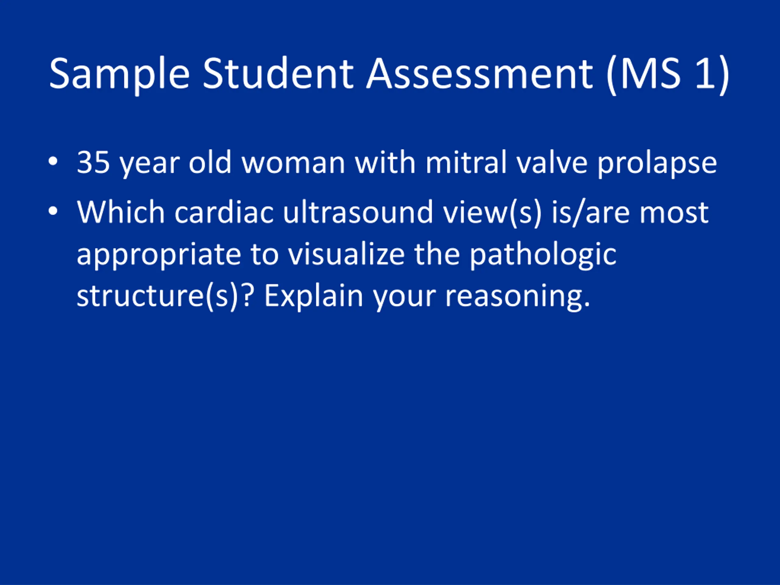 Sample Student Assessment (MS 1) 35 year old woman with mitral valve prolapse Which cardiac ultrasound view(s) is/are most appropriate to visualize the pathologic structure(s)? Explain your reasoning.