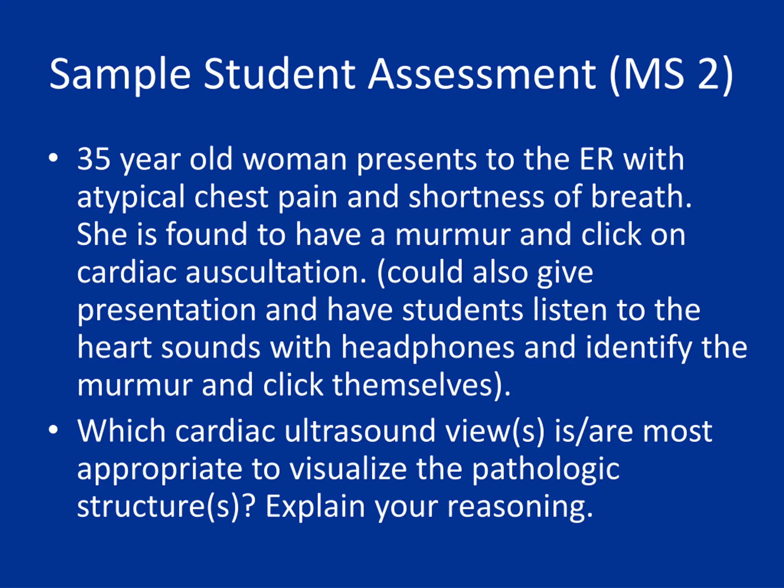 Sample Student Assessment (MS 2) 35 year old woman presents to the ER with atypical chest pain and shortness of breath. She is found to have a murmur and click on cardiac auscultation. (could also give presentation and have students listen to the heart sounds with headphones and identify the murmur and click themselves). Which cardiac ultrasound view(s) is/are most appropriate to visualize the pathologic structure(s)? Explain your reasoning.