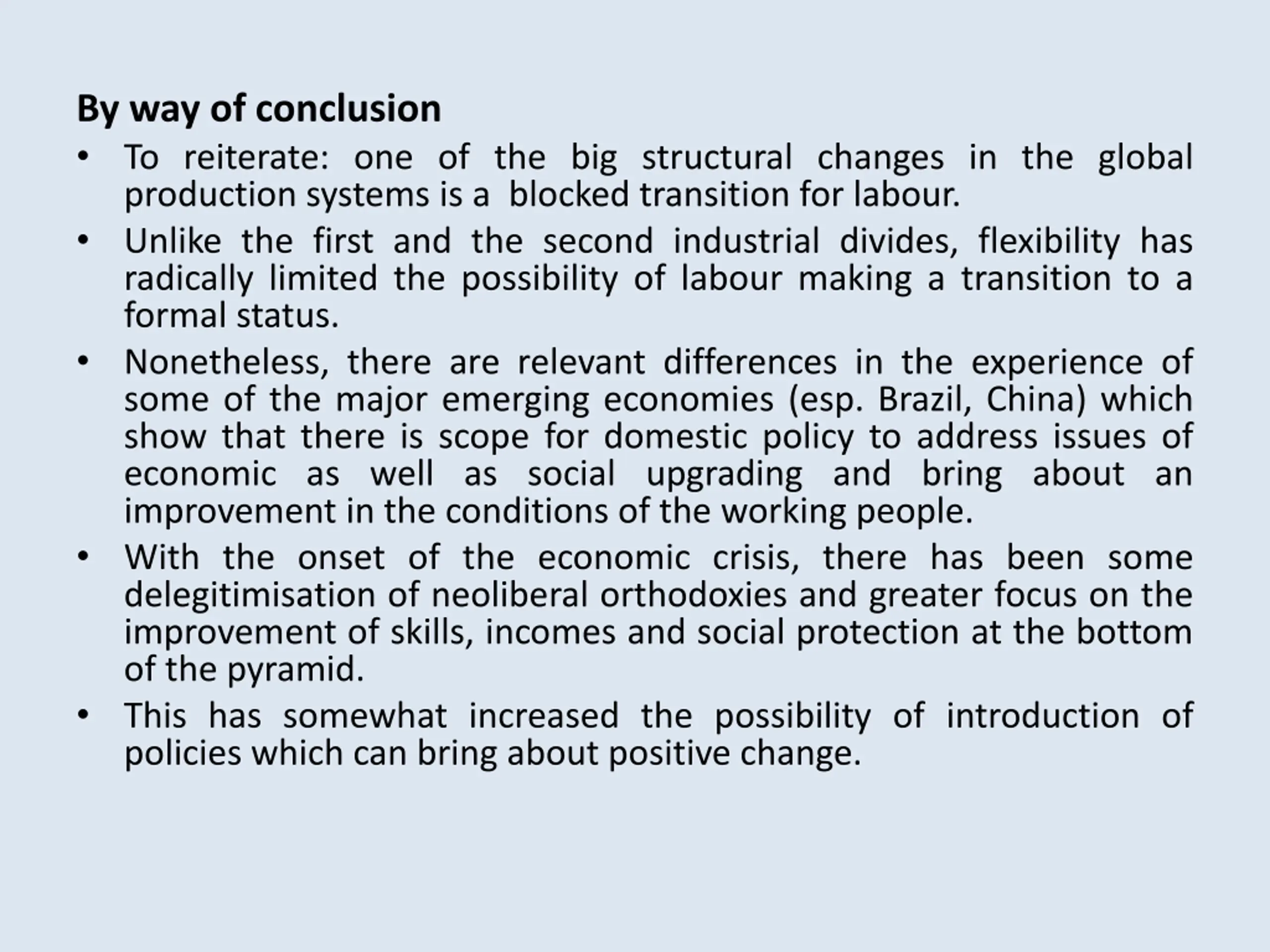 By way of conclusion To reiterate: one of the big structural changes in the global production systems is a blocked transition for labour. Unlike the first and the second industrial divides, flexibility has radically limited the possibility of labour making a transition to a formal status. Nonetheless, there are relevant differences in the experience of some of the major emerging economies (esp. Brazil, China) which show that there is scope for domestic policy to address issues of economic as well as social upgrading and bring about an improvement in the conditions of the working people. With the onset of the economic crisis, there has been some delegitimisation of neoliberal orthodoxies and greater focus on the improvement of skills, incomes and social protection at the bottom of the pyramid. This has somewhat increased the possibility of introduction of policies which can bring about positive change.