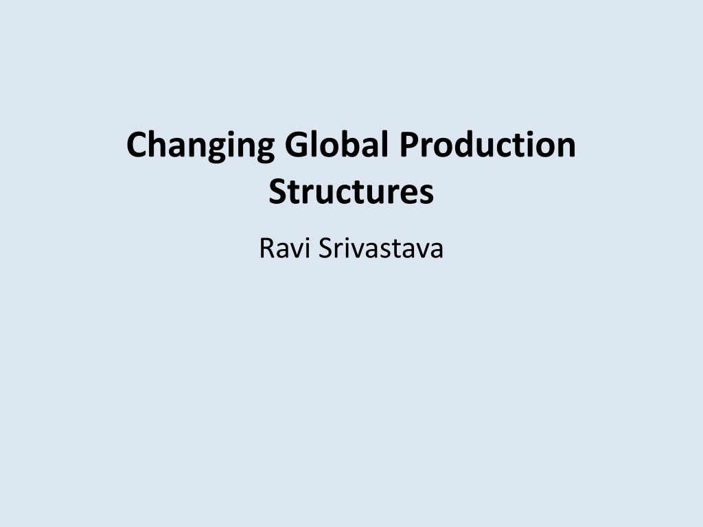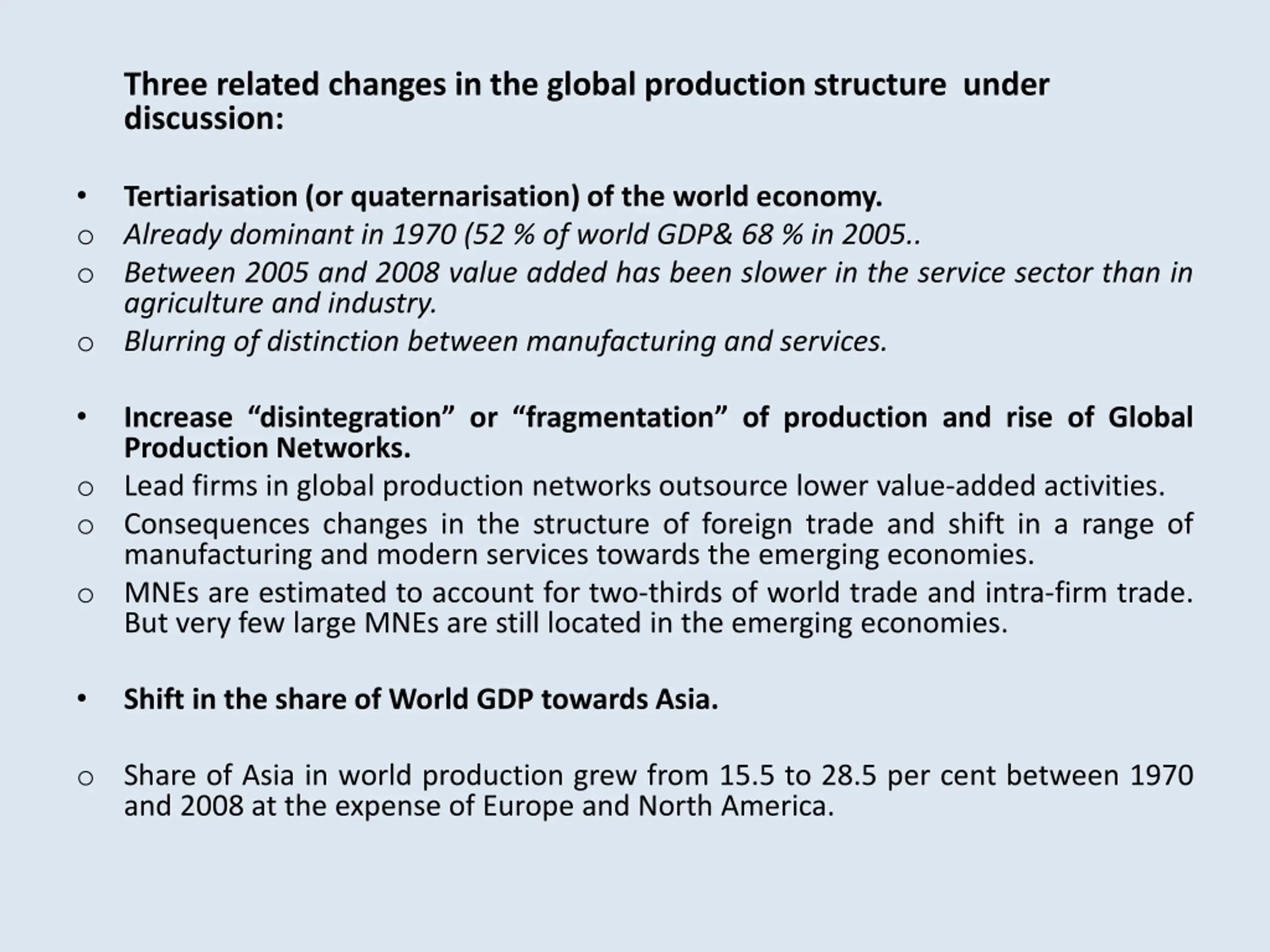 Three related changes in the global production structure under discussion: o Already dominant in 1970 (52 % of world GDP& 68 % in 2005.. o Between 2005 and 2008 value added has been slower in the service sector than in agriculture and industry. o Blurring of distinction between manufacturing and services. Tertiarisation (or quaternarisation) of the world economy. Increase disintegration or fragmentation of production and rise of Global Production Networks. o Lead firms in global production networks outsource lower value-added activities. o Consequences changes in the structure of foreign trade and shift in a range of manufacturing and modern services towards the emerging economies. o MNEs are estimated to account for two-thirds of world trade and intra-firm trade. But very few large MNEs are still located in the emerging economies. Shift in the share of World GDP towards Asia. o Share of Asia in world production grew from 15.5 to 28.5 per cent between 1970 and 2008 at the expense of Europe and North America.