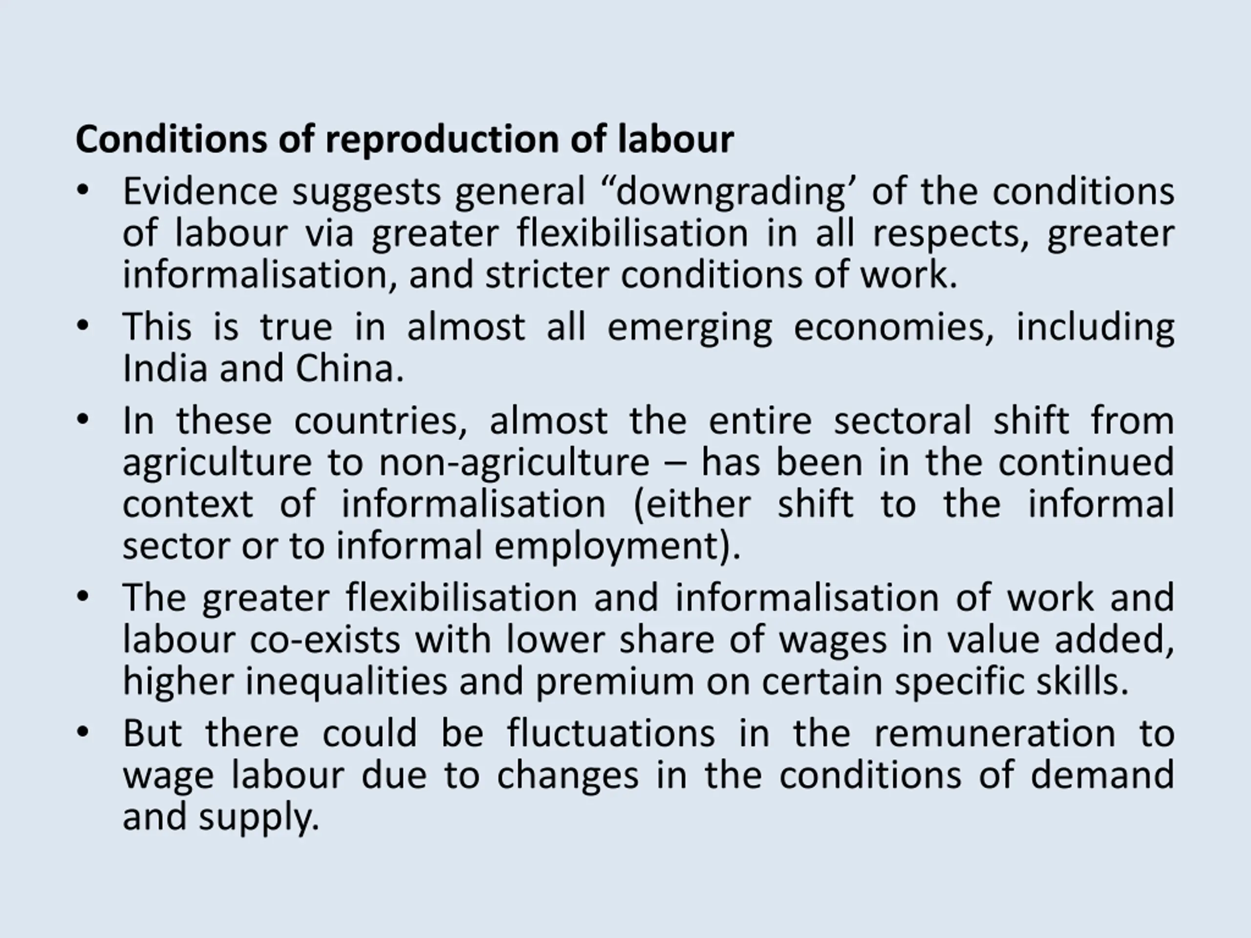 Conditions of reproduction of labour Evidence suggests general downgrading of the conditions of labour via greater flexibilisation in all respects, greater informalisation, and stricter conditions of work. This is true in almost all emerging economies, including India and China. In these countries, almost the entire sectoral shift from agriculture to non-agriculture has been in the continued context of informalisation (either shift to the informal sector or to informal employment). The greater flexibilisation and informalisation of work and labour co-exists with lower share of wages in value added, higher inequalities and premium on certain specific skills. But there could be fluctuations in the remuneration to wage labour due to changes in the conditions of demand and supply.