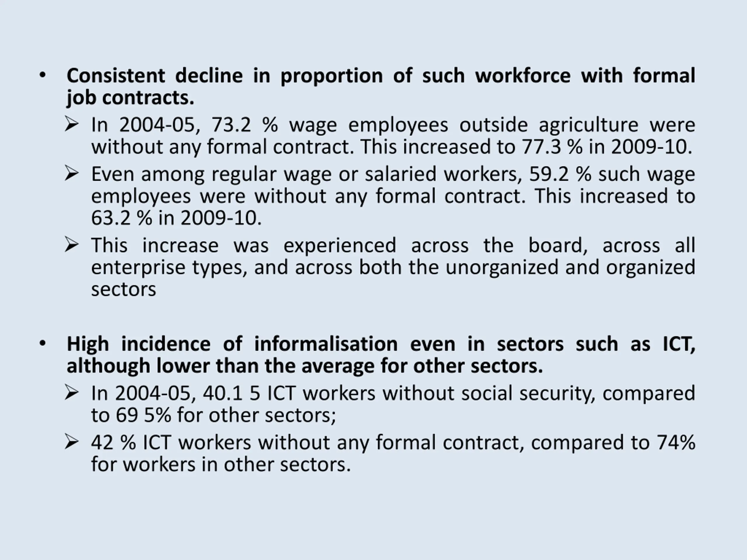 Consistent decline in proportion of such workforce with formal job contracts. In 2004-05, 73.2 % wage employees outside agriculture were without any formal contract. This increased to 77.3 % in 2009-10. Even among regular wage or salaried workers, 59.2 % such wage employees were without any formal contract. This increased to 63.2 % in 2009-10. This increase was experienced across the board, across all enterprise types, and across both the unorganized and organized sectors High incidence of informalisation even in sectors such as ICT, although lower than the average for other sectors. In 2004-05, 40.1 5 ICT workers without social security, compared to 69 5% for other sectors; 42 % ICT workers without any formal contract, compared to 74% for workers in other sectors.