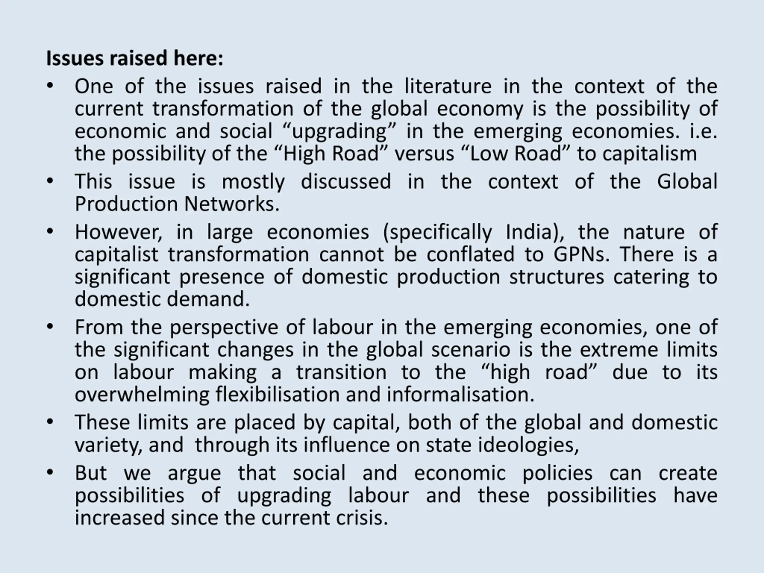 Issues raised here: One of the issues raised in the literature in the context of the current transformation of the global economy is the possibility of economic and social upgrading in the emerging economies. i.e. the possibility of the High Road versus Low Road to capitalism This issue is mostly discussed in the context of the Global Production Networks. However, in large economies (specifically India), the nature of capitalist transformation cannot be conflated to GPNs. There is a significant presence of domestic production structures catering to domestic demand. From the perspective of labour in the emerging economies, one of the significant changes in the global scenario is the extreme limits on labour making a transition to the high road due to its overwhelming flexibilisation and informalisation. These limits are placed by capital, both of the global and domestic variety, and through its influence on state ideologies, But we argue that social and economic policies can create possibilities of upgrading labour and these possibilities have increased since the current crisis.