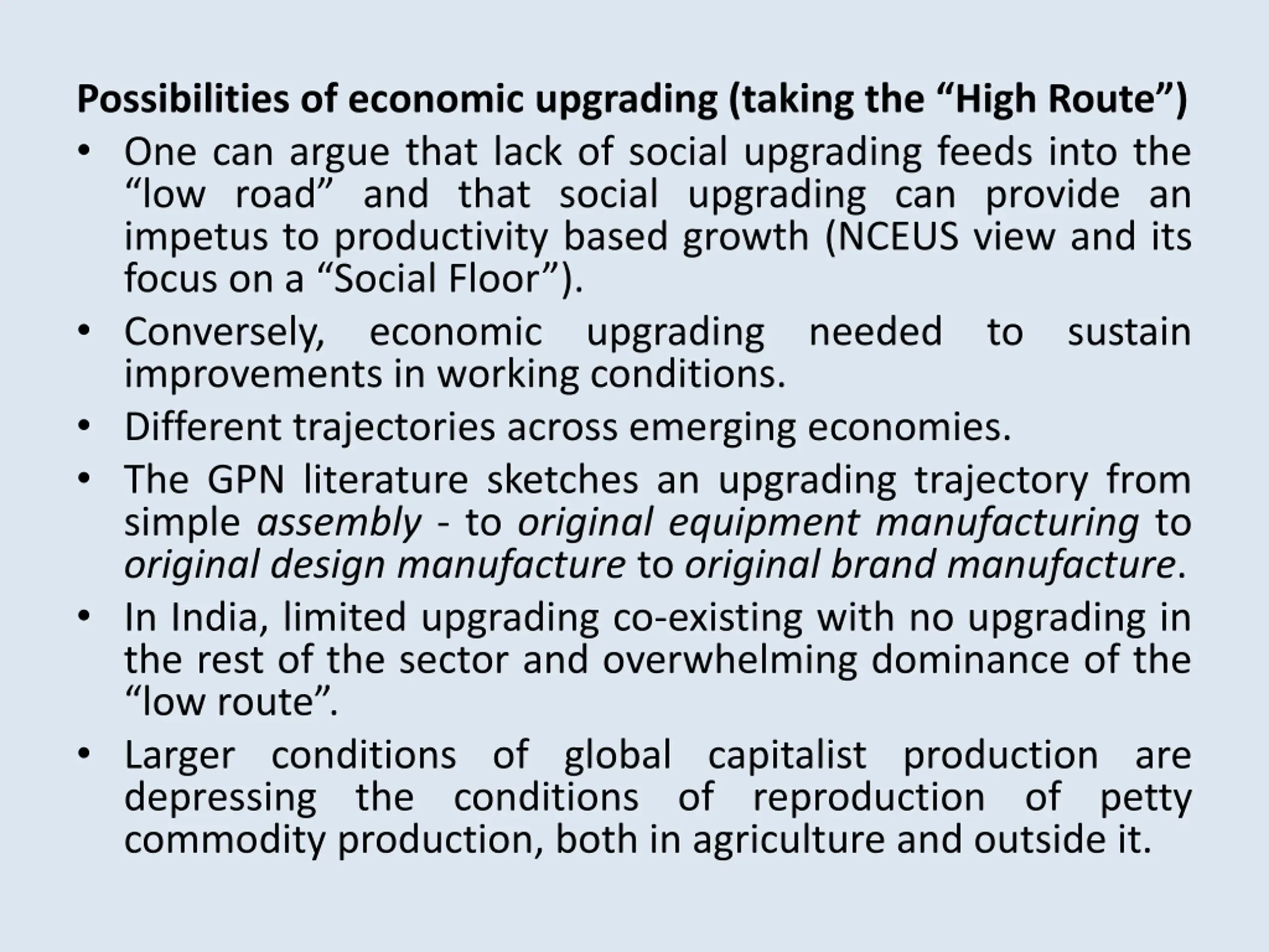 Possibilities of economic upgrading (taking the High Route) One can argue that lack of social upgrading feeds into the low road and that social upgrading can provide an impetus to productivity based growth (NCEUS view and its focus on a Social Floor ). Conversely, economic upgrading improvements in working conditions. Different trajectories across emerging economies. The GPN literature sketches an upgrading trajectory from simple assembly - to original equipment manufacturing to original design manufacture to original brand manufacture. In India, limited upgrading co-existing with no upgrading in the rest of the sector and overwhelming dominance of the low route . Larger conditions of global capitalist production are depressing the conditions of reproduction of petty commodity production, both in agriculture and outside it. needed to sustain