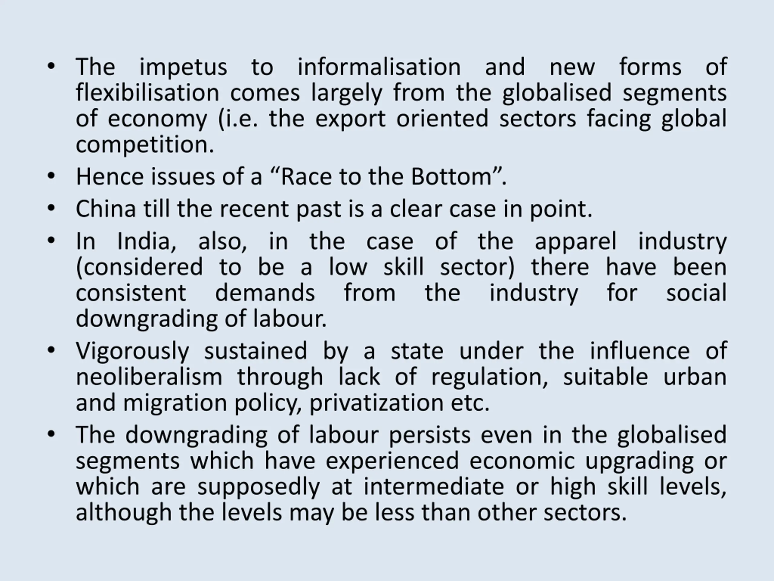The impetus to informalisation and new forms of flexibilisation comes largely from the globalised segments of economy (i.e. the export oriented sectors facing global competition. Hence issues of a Race to the Bottom . China till the recent past is a clear case in point. In India, also, in the case of the apparel industry (considered to be a low skill sector) there have been consistent demands from downgrading of labour. Vigorously sustained by a state under the influence of neoliberalism through lack of regulation, suitable urban and migration policy, privatization etc. The downgrading of labour persists even in the globalised segments which have experienced economic upgrading or which are supposedly at intermediate or high skill levels, although the levels may be less than other sectors. the industry for social