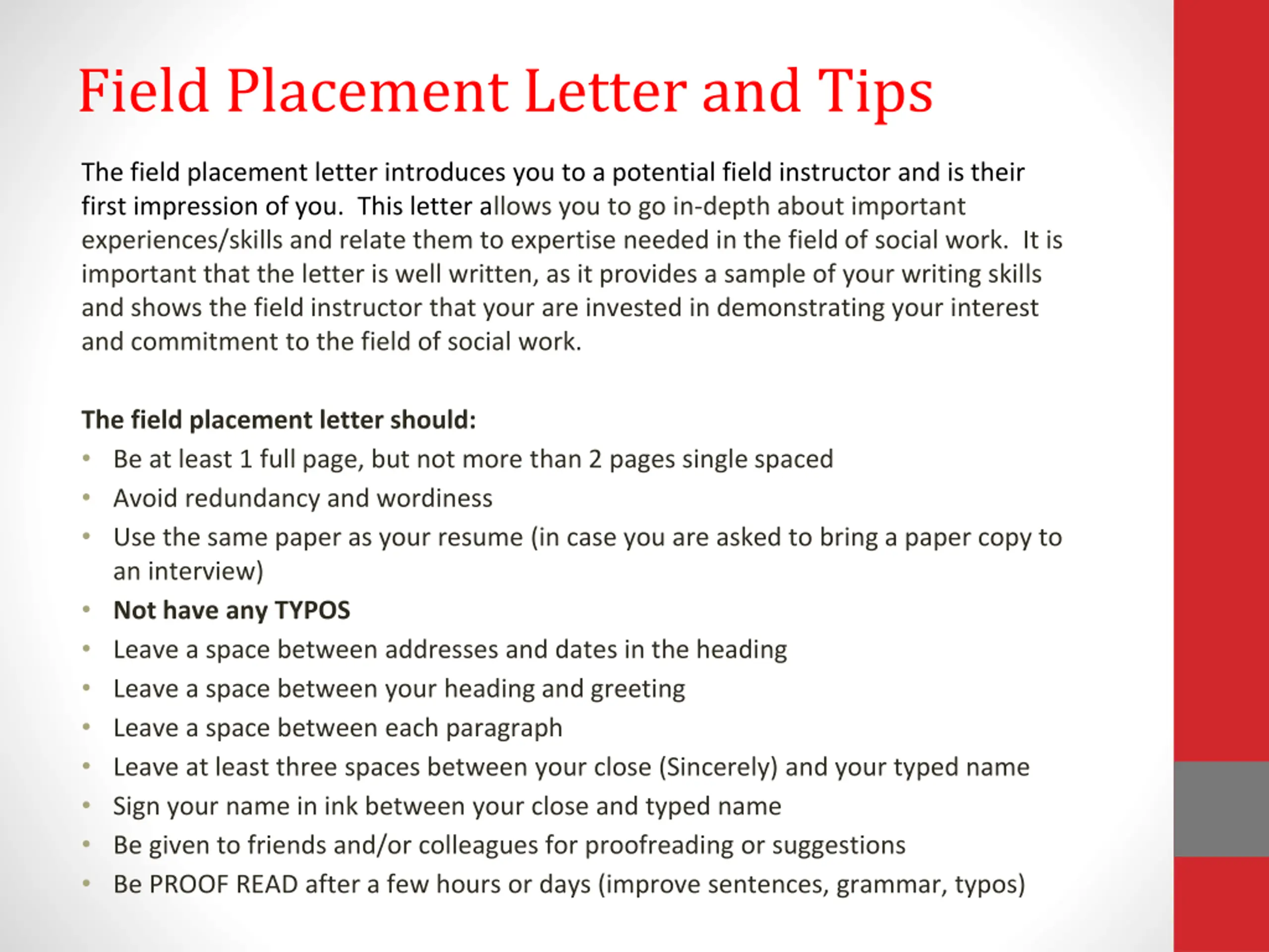 Field Placement Letter and Tips The field placement letter introduces you to a potential field instructor and is their first impression of you. This letter allows you to go in-depth about important experiences/skills and relate them to expertise needed in the field of social work. It is important that the letter is well written, as it provides a sample of your writing skills and shows the field instructor that your are invested in demonstrating your interest and commitment to the field of social work. The field placement letter should: Be at least 1 full page, but not more than 2 pages single spaced Avoid redundancy and wordiness Use the same paper as your resume (in case you are asked to bring a paper copy to an interview) Not have any TYPOS Leave a space between addresses and dates in the heading Leave a space between your heading and greeting Leave a space between each paragraph Leave at least three spaces between your close (Sincerely) and your typed name Sign your name in ink between your close and typed name Be given to friends and/or colleagues for proofreading or suggestions Be PROOF READ after a few hours or days (improve sentences, grammar, typos)