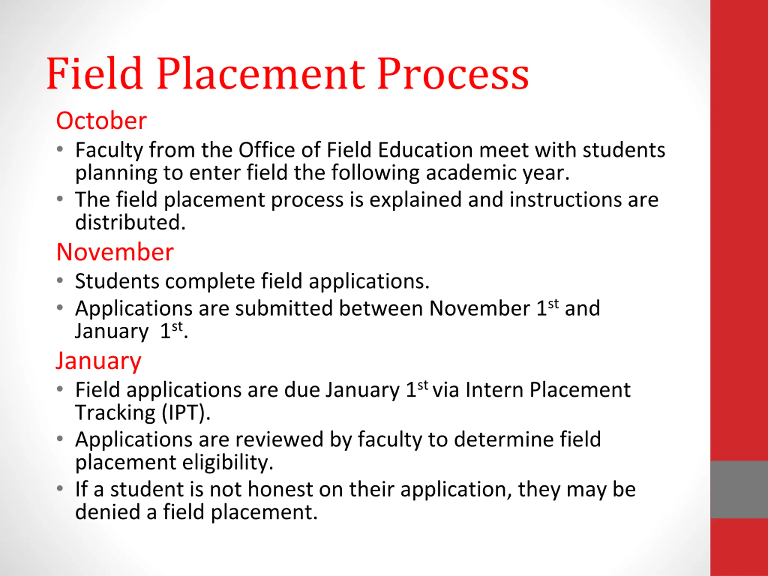 Field Placement Process October Faculty from the Office of Field Education meet with students planning to enter field the following academic year. The field placement process is explained and instructions are distributed. November Students complete field applications. Applications are submitted between November 1stand January 1st. January Field applications are due January 1st via Intern Placement Tracking (IPT). Applications are reviewed by faculty to determine field placement eligibility. If a student is not honest on their application, they may be denied a field placement.