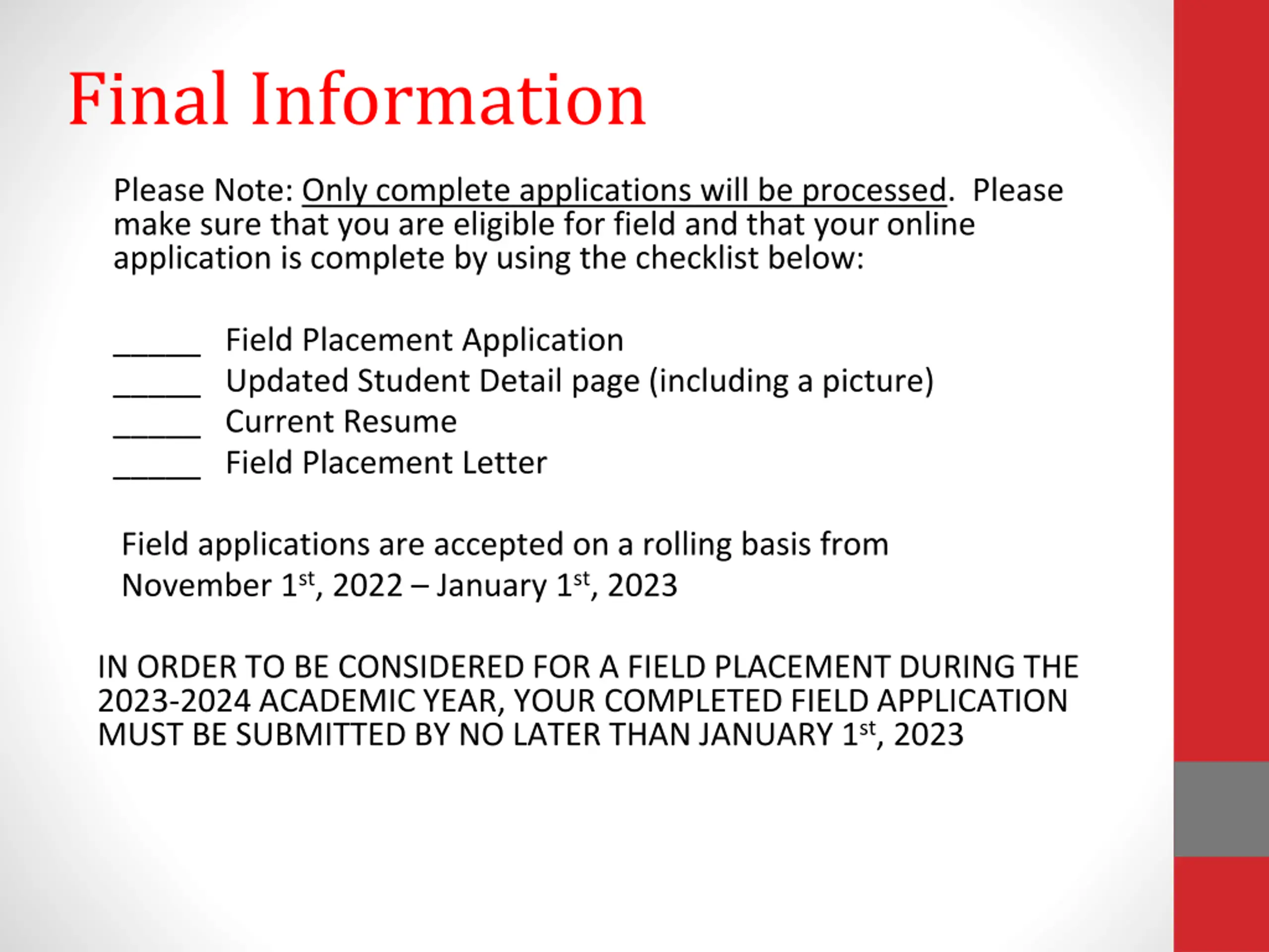 Final Information Please Note: Only complete applications will be processed. Please make sure that you are eligible for field and that your online application is complete by using the checklist below: _____ Field Placement Application _____ Updated Student Detail page (including a picture) _____ Current Resume _____ Field Placement Letter Field applications are accepted on a rolling basis from November 1st, 2022 January 1st, 2023 IN ORDER TO BE CONSIDERED FOR A FIELD PLACEMENT DURING THE 2023-2024 ACADEMIC YEAR, YOUR COMPLETED FIELD APPLICATION MUST BE SUBMITTED BY NO LATER THAN JANUARY 1st, 2023
