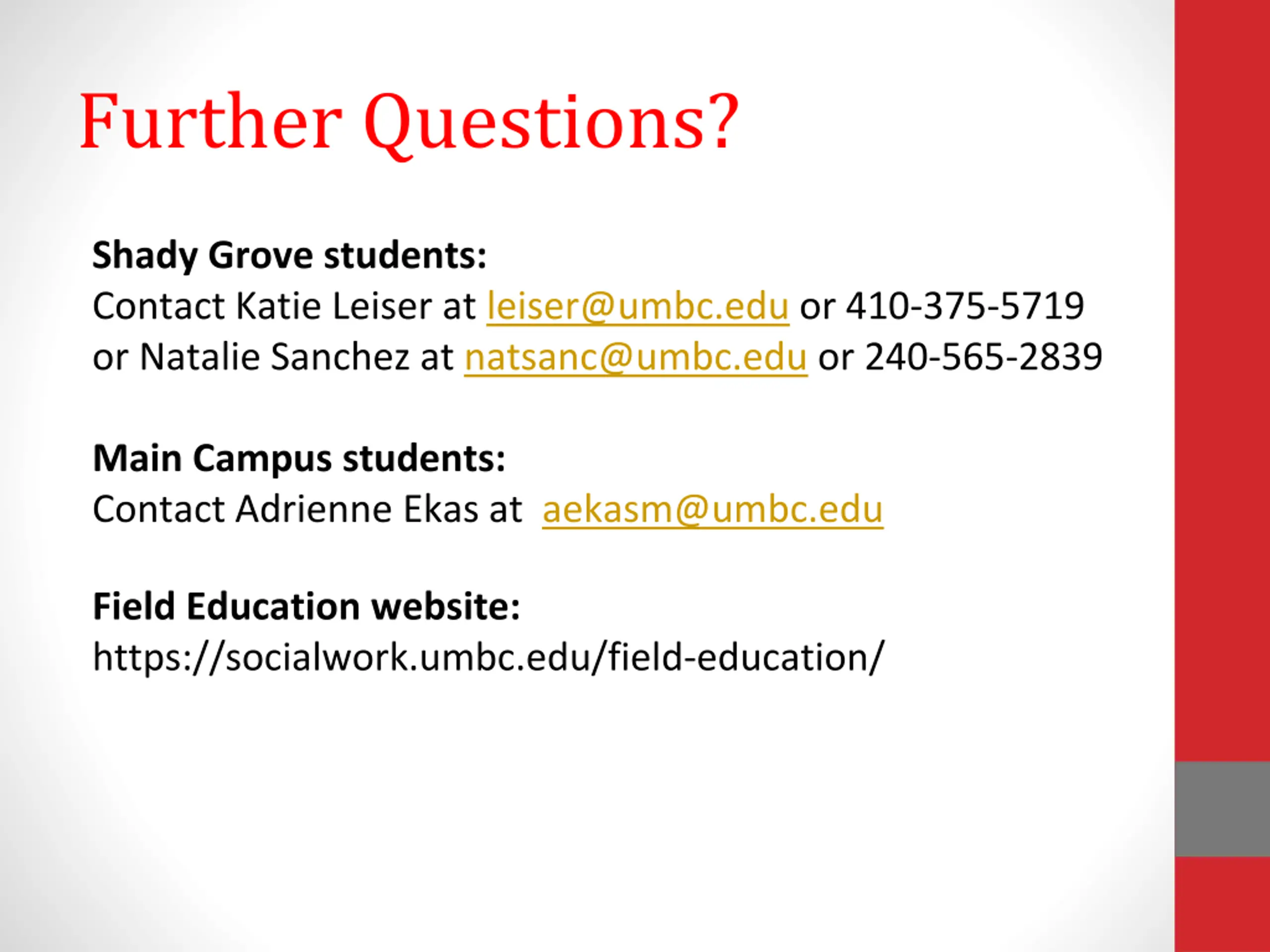 Further Questions? Shady Grove students: Contact Katie Leiser at leiser@umbc.edu or 410-375-5719 or Natalie Sanchez at natsanc@umbc.edu or 240-565-2839 Main Campus students: Contact Adrienne Ekas at aekasm@umbc.edu Field Education website: https://socialwork.umbc.edu/field-education/
