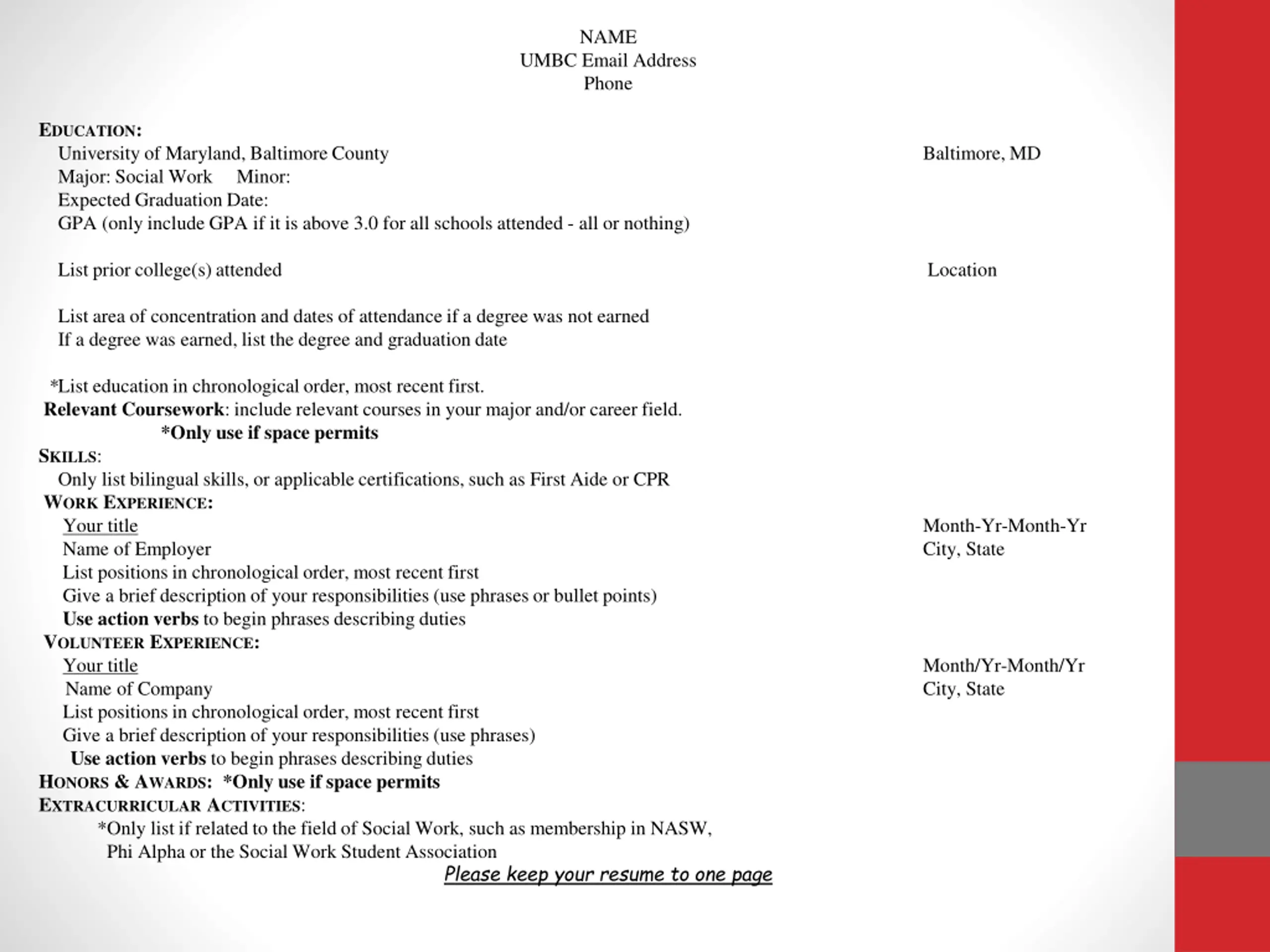 NAME UMBC Email Address Phone EDUCATION: University of Maryland, Baltimore County Major: Social Work Minor: Expected Graduation Date: GPA (only include GPA if it is above 3.0 for all schools attended - all or nothing) Baltimore, MD List prior college(s) attended Location List area of concentration and dates of attendance if a degree was not earned If a degree was earned, list the degree and graduation date *List education in chronological order, most recent first. Relevant Coursework: include relevant courses in your major and/or career field. *Only use if space permits SKILLS: Only list bilingual skills, or applicable certifications, such as First Aide or CPR WORK EXPERIENCE: Your title Name of Employer List positions in chronological order, most recent first Give a brief description of your responsibilities (use phrases or bullet points) Use action verbs to begin phrases describing duties VOLUNTEER EXPERIENCE: Your title Name of Company List positions in chronological order, most recent first Give a brief description of your responsibilities (use phrases) Use action verbs to begin phrases describing duties HONORS & AWARDS: *Only use if space permits EXTRACURRICULAR ACTIVITIES: *Only list if related to the field of Social Work, such as membership in NASW, Phi Alpha or the Social Work Student Association Month-Yr-Month-Yr City, State Month/Yr-Month/Yr City, State Please keep your resume to one page