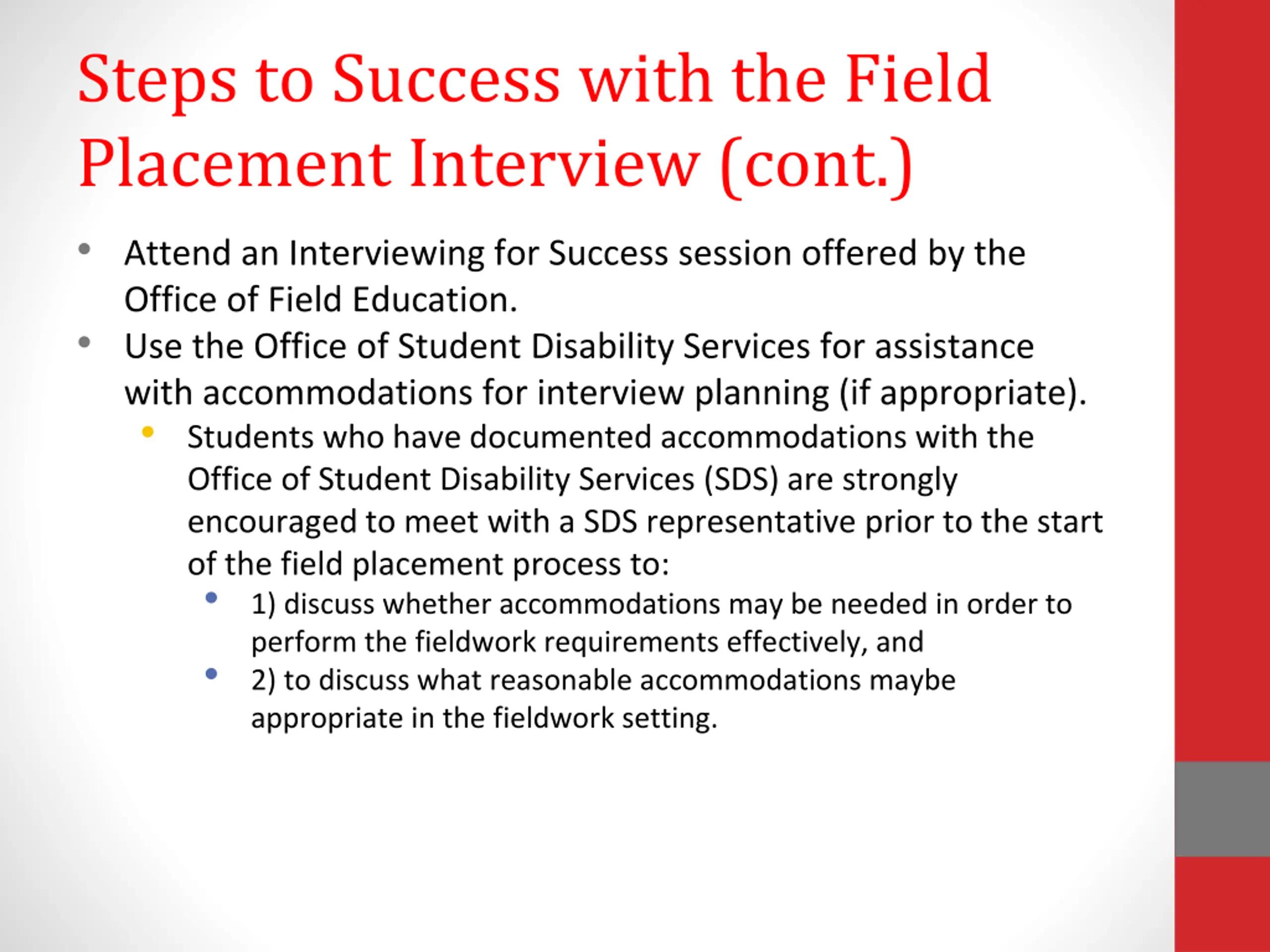 Steps to Success with the Field Placement Interview (cont.) Attend an Interviewing for Success session offered by the Office of Field Education. Use the Office of Student Disability Services for assistance with accommodations for interview planning (if appropriate). Students who have documented accommodations with the Office of Student Disability Services (SDS) are strongly encouraged to meet with a SDS representative prior to the start of the field placement process to: 1) discuss whether accommodations may be needed in order to perform the fieldwork requirements effectively, and 2) to discuss what reasonable accommodations maybe appropriate in the fieldwork setting.