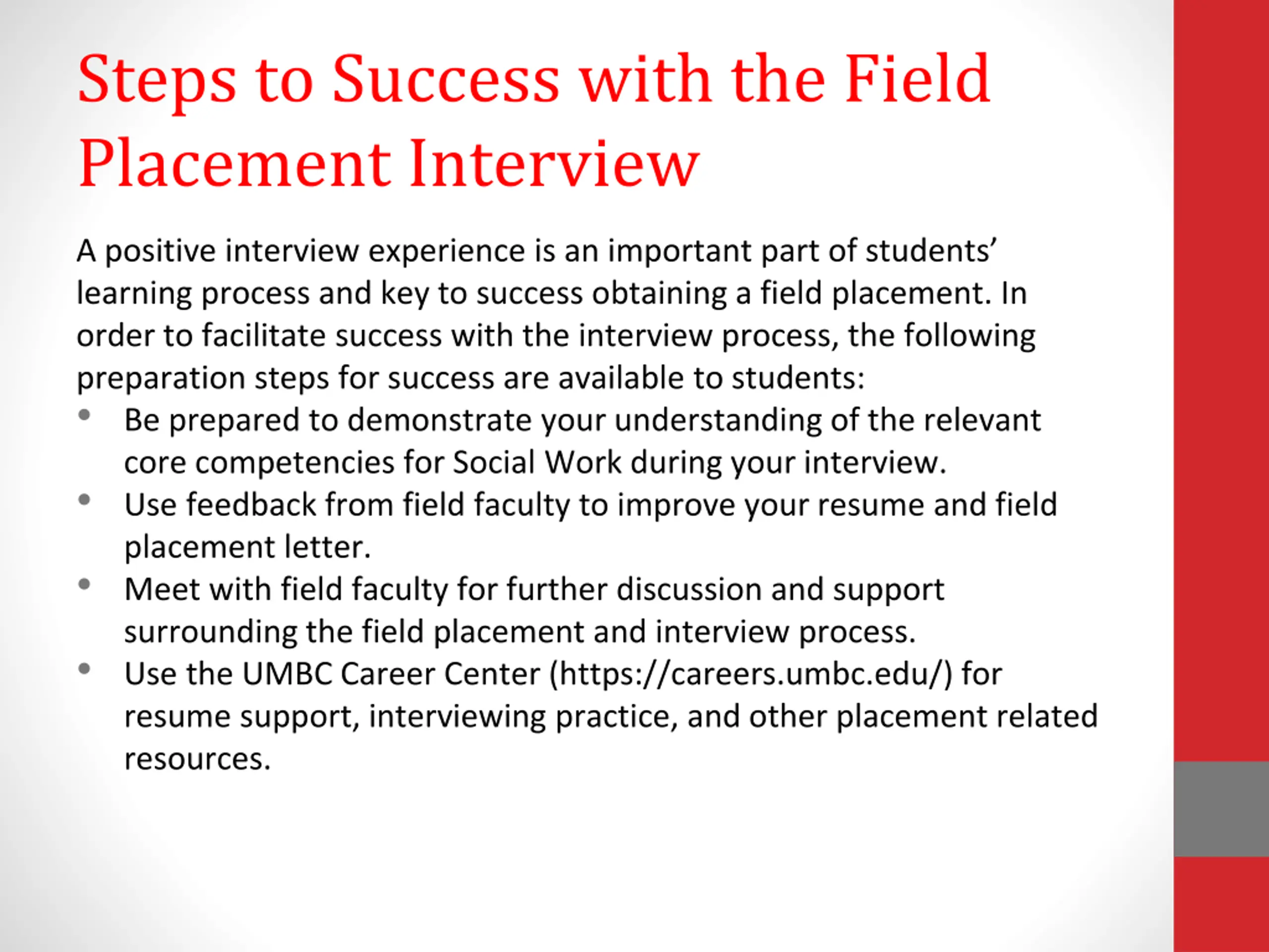 Steps to Success with the Field Placement Interview A positive interview experience is an important part of students learning process and key to success obtaining a field placement. In order to facilitate success with the interview process, the following preparation steps for success are available to students: Be prepared to demonstrate your understanding of the relevant core competencies for Social Work during your interview. Use feedback from field faculty to improve your resume and field placement letter. Meet with field faculty for further discussion and support surrounding the field placement and interview process. Use the UMBC Career Center (https://careers.umbc.edu/) for resume support, interviewing practice, and other placement related resources.
