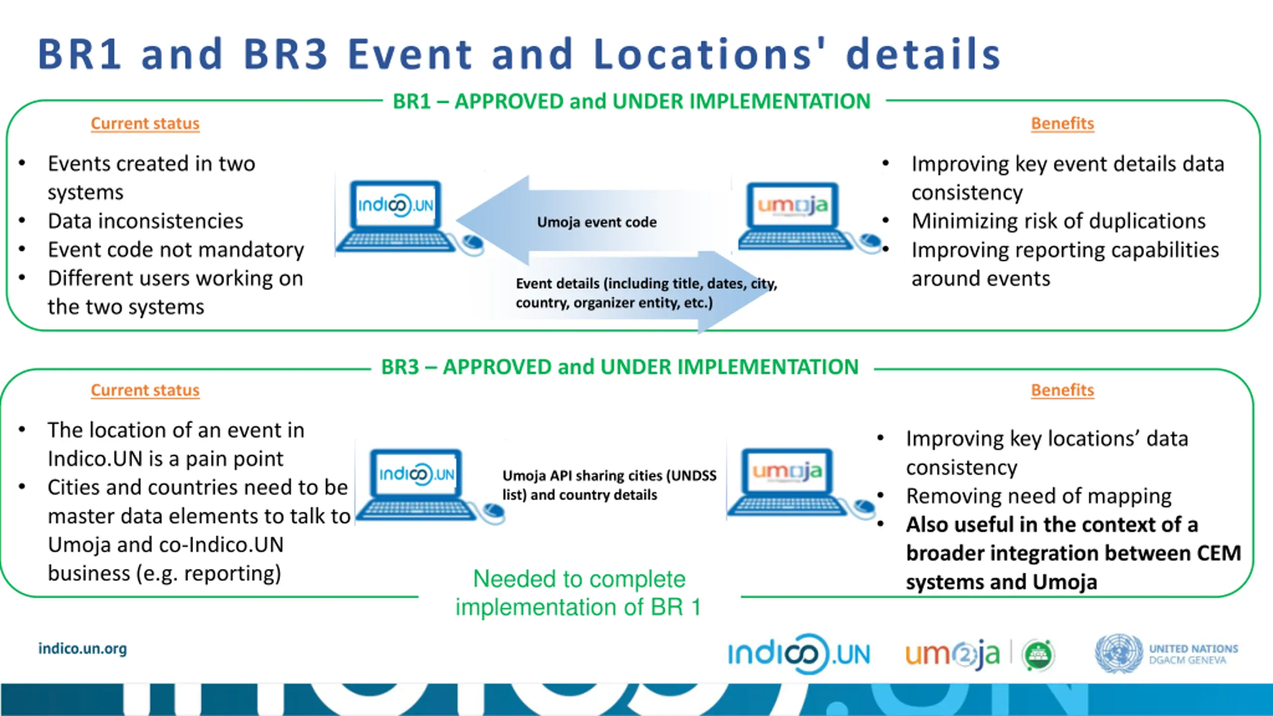BR1 and BR3 Event and Locations' details BR1 APPROVED and UNDER IMPLEMENTATION Current status Benefits Events created in two systems Data inconsistencies Event code not mandatory Different users working on the two systems Improving key event details data consistency Minimizing risk of duplications Improving reporting capabilities around events Umoja event code Event details (including title, dates, city, country, organizer entity, etc.) BR3 APPROVED and UNDER IMPLEMENTATION Current status Benefits The location of an event in Indico.UN is a pain point Cities and countries need to be master data elements to talk to Umoja and co-Indico.UN business (e.g. reporting) Improving key locations data consistency Removing need of mapping Also useful in the context of a broader integration between CEM systems and Umoja Umoja API sharing cities (UNDSS list) and country details Needed to complete implementation of BR 1 indico.un.org