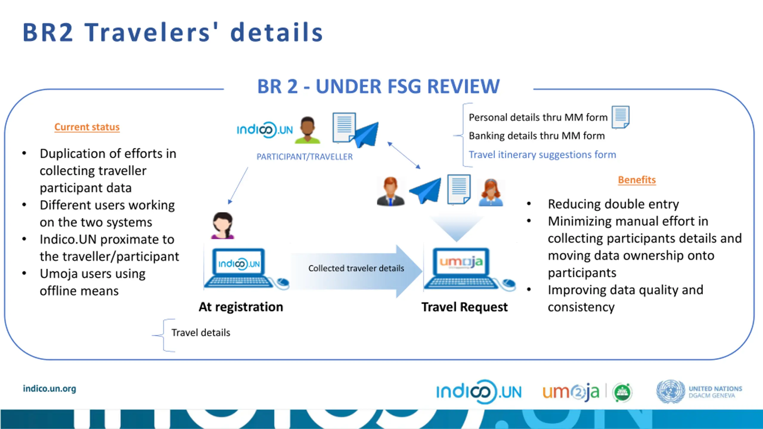 BR2 Travelers' details BR 2 - UNDER FSG REVIEW Personal details thru MM form Current status Banking details thru MM form Duplication of efforts in collecting traveller participant data Different users working on the two systems Indico.UN proximate to the traveller/participant Umoja users using offline means Travel itinerary suggestions form PARTICIPANT/TRAVELLER Benefits Reducing double entry Minimizing manual effort in collecting participants details and moving data ownership onto participants Improving data quality and consistency Collected traveler details At registration Travel Request Travel details indico.un.org