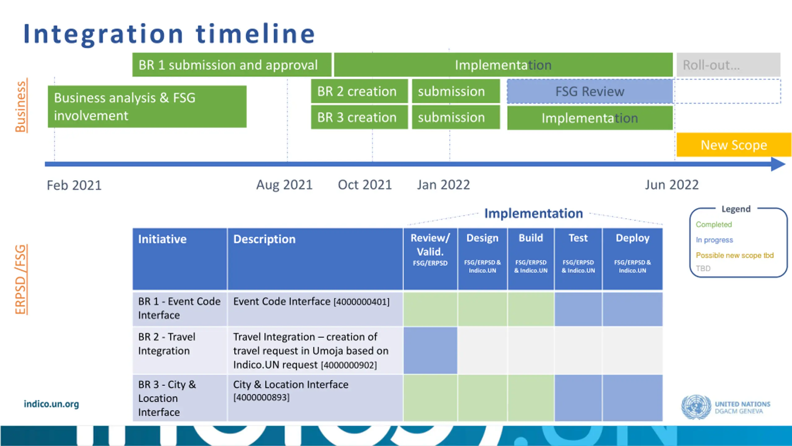 Integration timeline BR 1 submission and approval Implementation Roll-out Business BR 2 creation submission FSG Review Business analysis & FSG involvement BR 3 creation submission Implementation New Scope Aug 2021 Oct 2021 Jan 2022 Jun 2022 Feb 2021 Legend Implementation Completed Review/ Valid. FSG/ERPSD Design Build Test Deploy Initiative Description In progress ERPSD /FSG Possible new scope tbd FSG/ERPSD & Indico.UN FSG/ERPSD & Indico.UN FSG/ERPSD & Indico.UN FSG/ERPSD & Indico.UN TBD BR 1 - Event Code Interface Event Code Interface [4000000401] BR 2 - Travel Integration Travel Integration creation of travel request in Umoja based on Indico.UN request [4000000902] BR 3 - City & Location Interface City & Location Interface [4000000893] indico.un.org