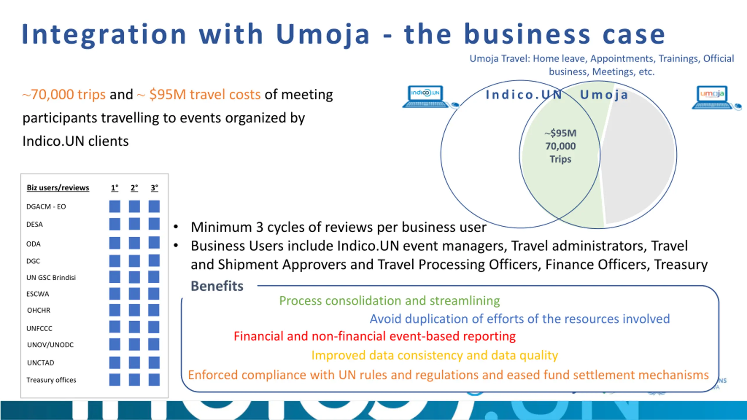 Integration with Umoja - the business case Umoja Travel: Home leave, Appointments, Trainings, Official business, Meetings, etc. 70,000 trips and $95M travel costs of meeting participants travelling to events organized by Indico.UN clients Indico.UN Umoja $95M 70,000 Trips Biz users/reviews 1 2 3 DGACM - EO Minimum 3 cycles of reviews per business user Business Users include Indico.UN event managers, Travel administrators, Travel and Shipment Approvers and Travel Processing Officers, Finance Officers, Treasury Officers. Benefits Process consolidation and streamlining Avoid duplication of efforts of the resources involved DESA ODA DGC UN GSC Brindisi ESCWA OHCHR UNFCCC Financial and non-financial event-based reporting UNOV/UNODC Improved data consistency and data quality UNCTAD Enforced compliance with UN rules and regulations and eased fund settlement mechanisms indico.un.org Treasury offices