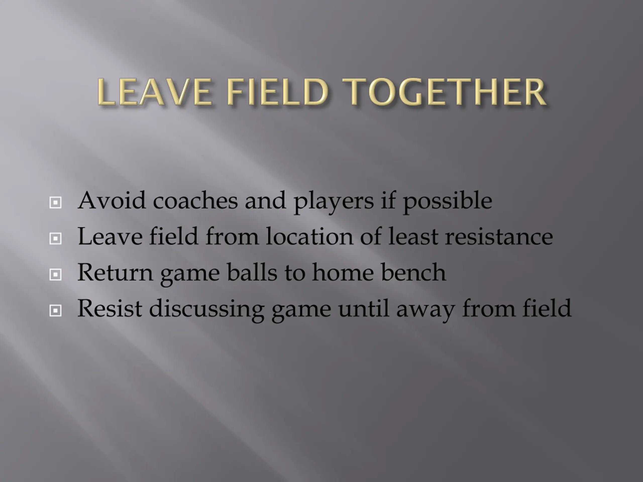 Avoid coaches and players if possible Leave field from location of least resistance Return game balls to home bench Resist discussing game until away from field