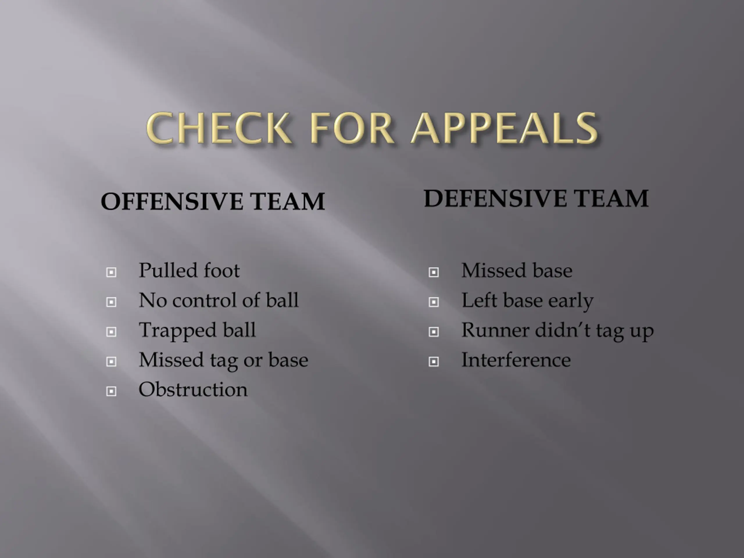 DEFENSIVE TEAM OFFENSIVE TEAM Pulled foot No control of ball Trapped ball Missed tag or base Obstruction Missed base Left base early Runner didn t tag up Interference