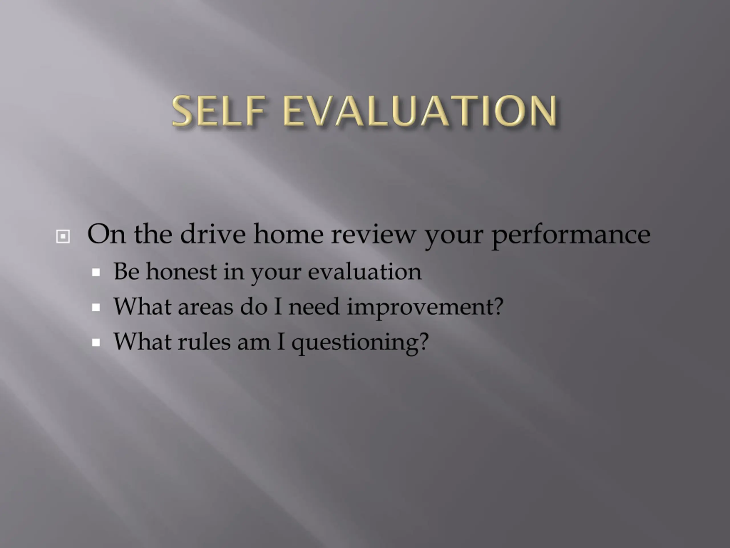 On the drive home review your performance Be honest in your evaluation What areas do I need improvement? What rules am I questioning?
