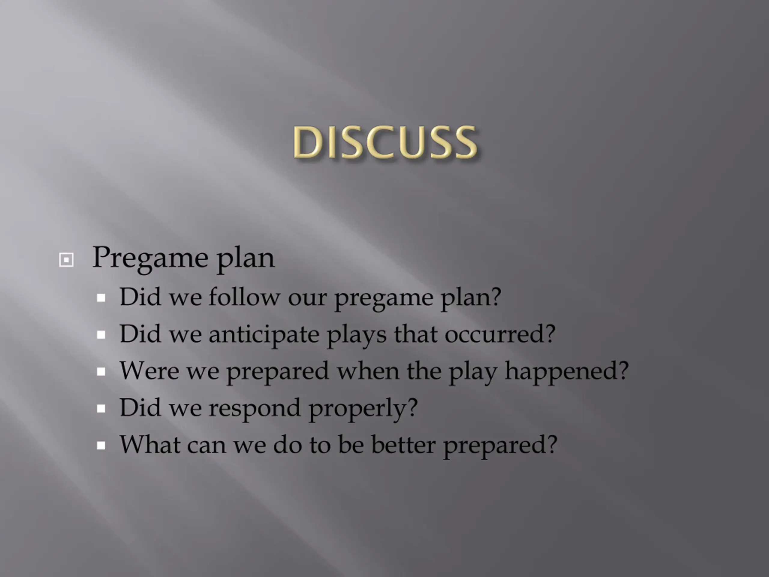 Pregame plan Did we follow our pregame plan? Did we anticipate plays that occurred? Were we prepared when the play happened? Did we respond properly? What can we do to be better prepared?