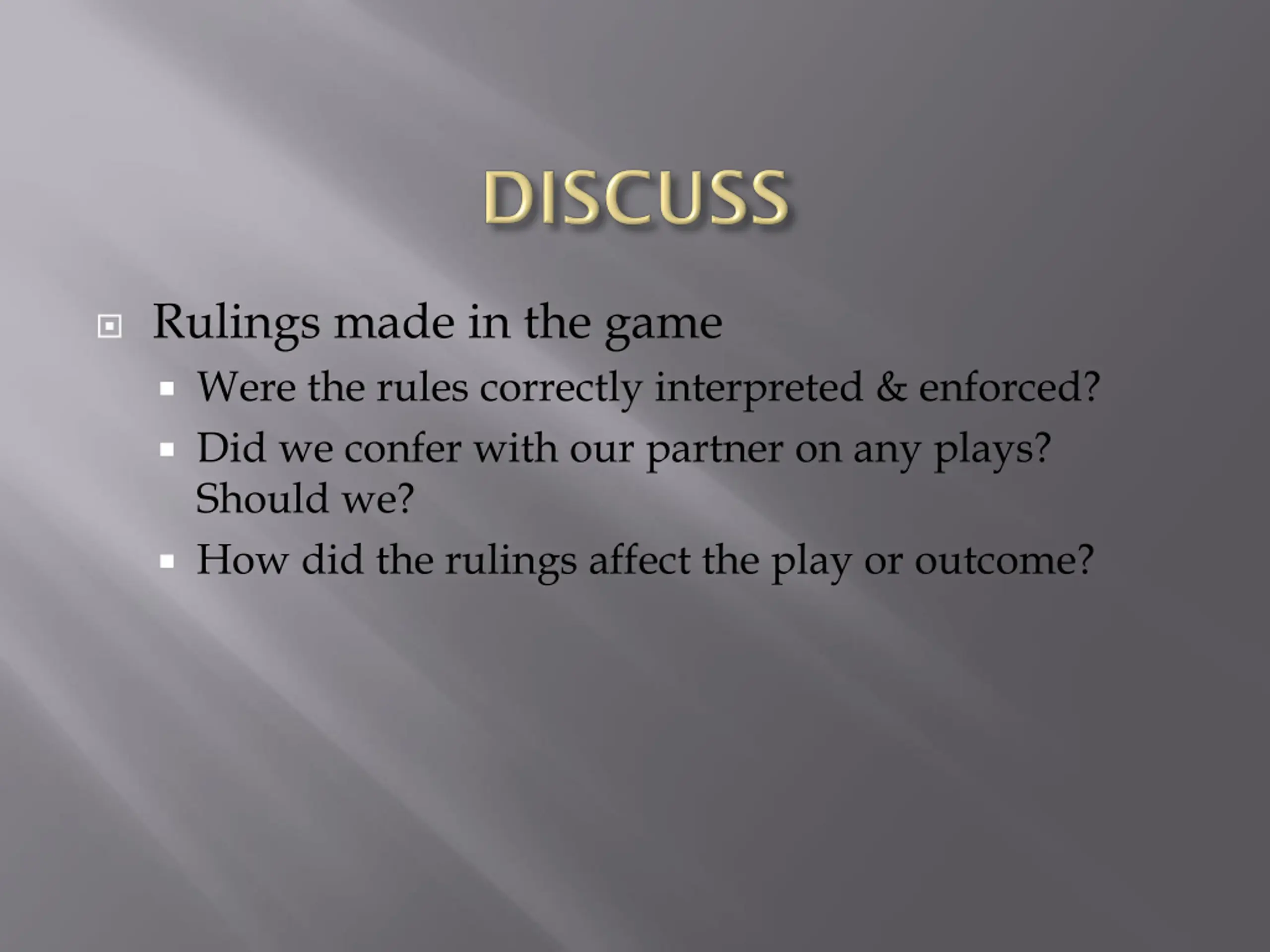 Rulings made in the game Were the rules correctly interpreted & enforced? Did we confer with our partner on any plays? Should we? How did the rulings affect the play or outcome?
