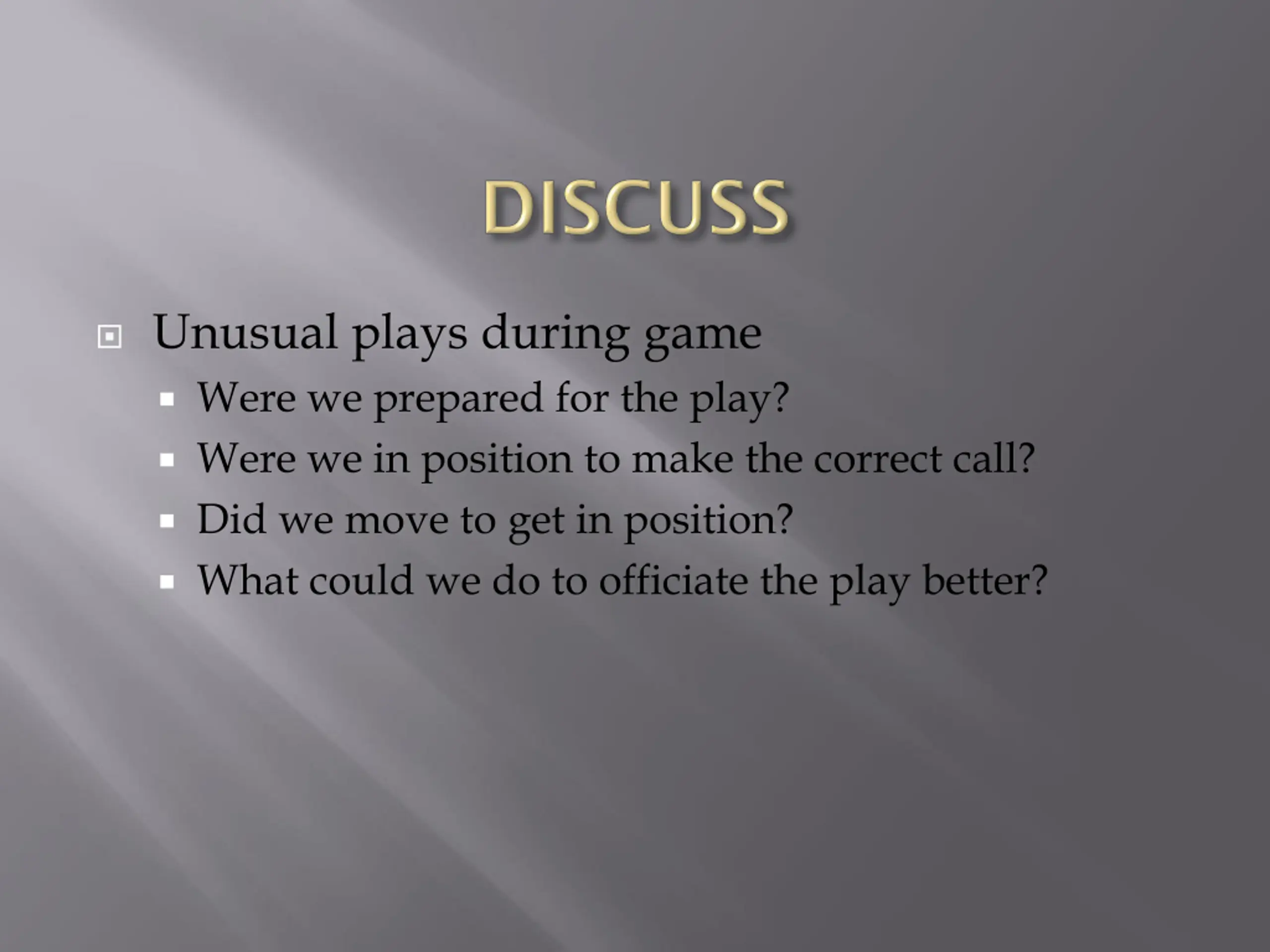 Unusual plays during game Were we prepared for the play? Were we in position to make the correct call? Did we move to get in position? What could we do to officiate the play better?
