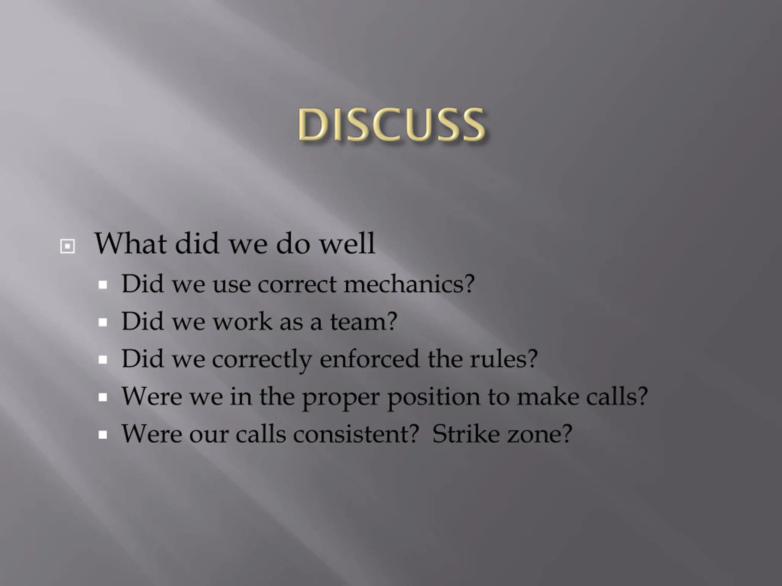 What did we do well Did we use correct mechanics? Did we work as a team? Did we correctly enforced the rules? Were we in the proper position to make calls? Were our calls consistent? Strike zone?