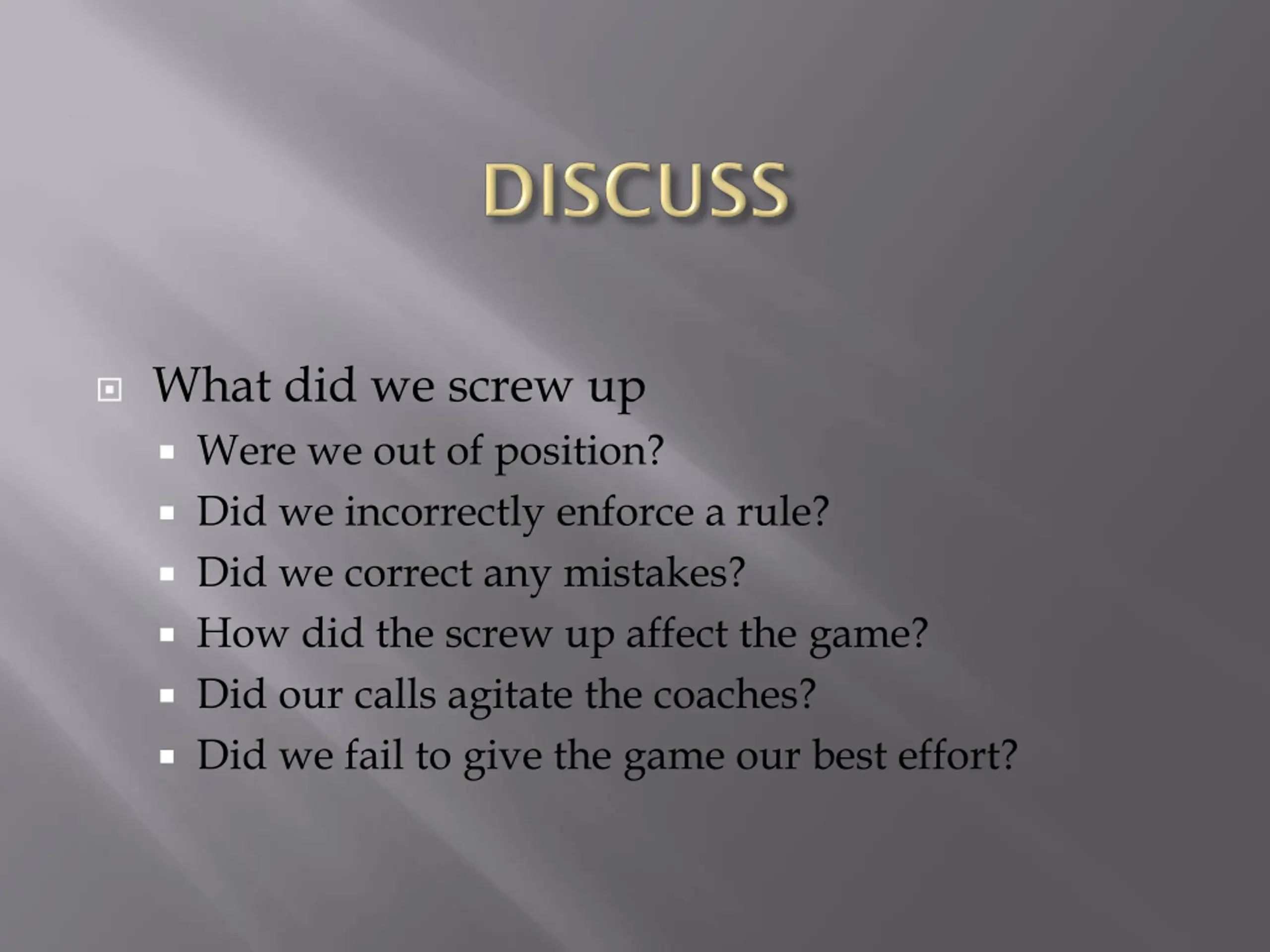 What did we screw up Were we out of position? Did we incorrectly enforce a rule? Did we correct any mistakes? How did the screw up affect the game? Did our calls agitate the coaches? Did we fail to give the game our best effort?