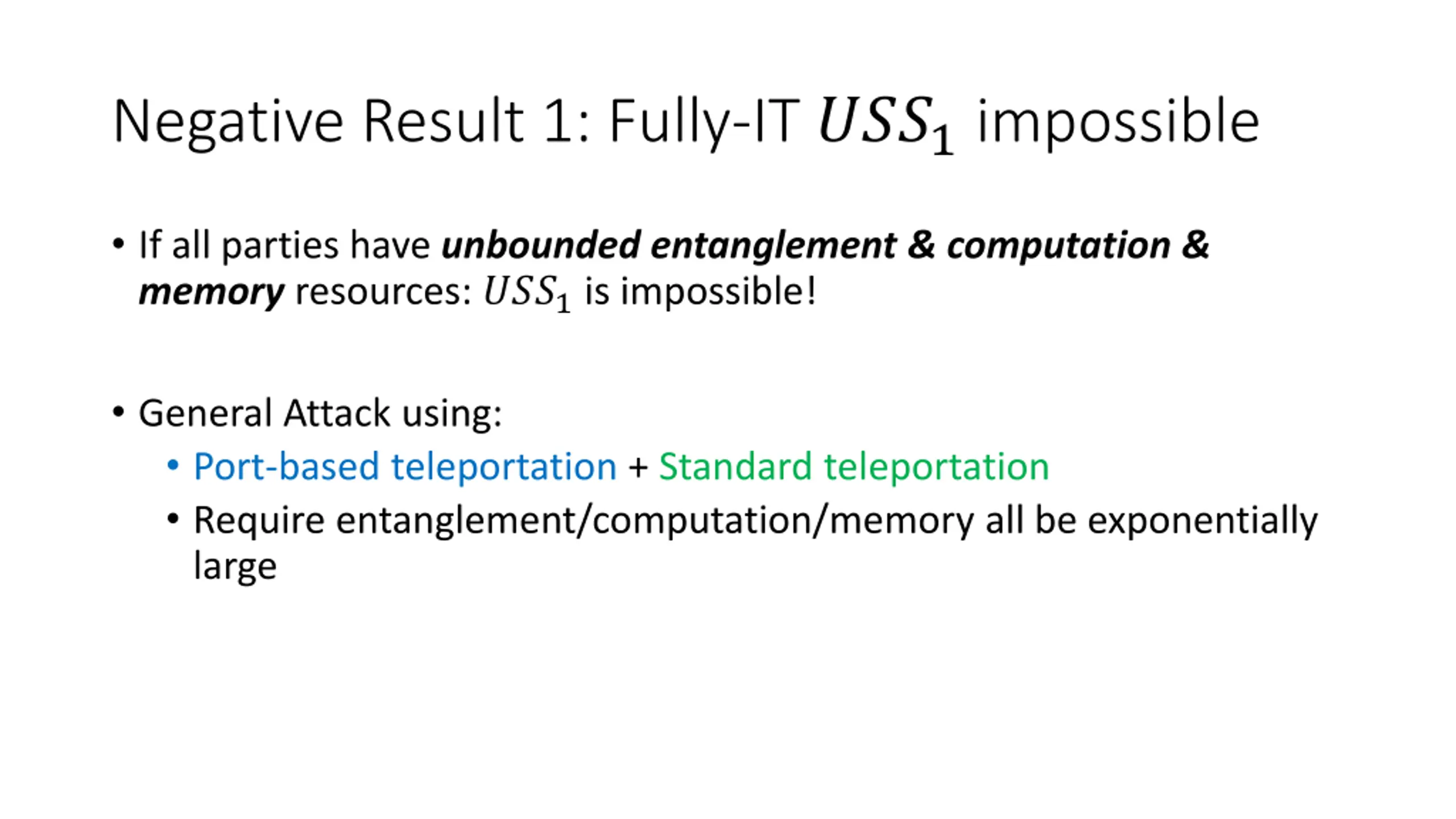 Negative Result 1: Fully-IT ???1 impossible If all parties have unbounded entanglement & computation & memory resources: ???1 is impossible! General Attack using: Port-based teleportation + Standard teleportation Require entanglement/computation/memory all be exponentially large