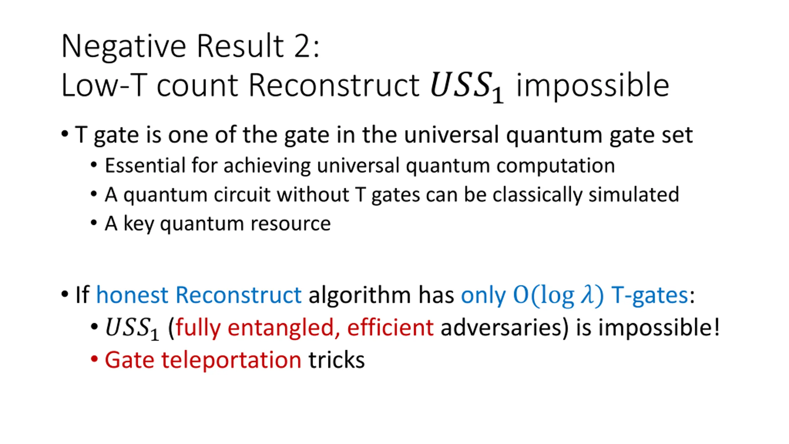 Negative Result 2: Low-T count Reconstruct ???1 impossible T gate is one of the gate in the universal quantum gate set Essential for achieving universal quantum computation A quantum circuit without T gates can be classically simulated A key quantum resource If honest Reconstruct algorithm has only (log ?) T-gates: ???1 (fully entangled, efficient adversaries) is impossible! Gate teleportation tricks
