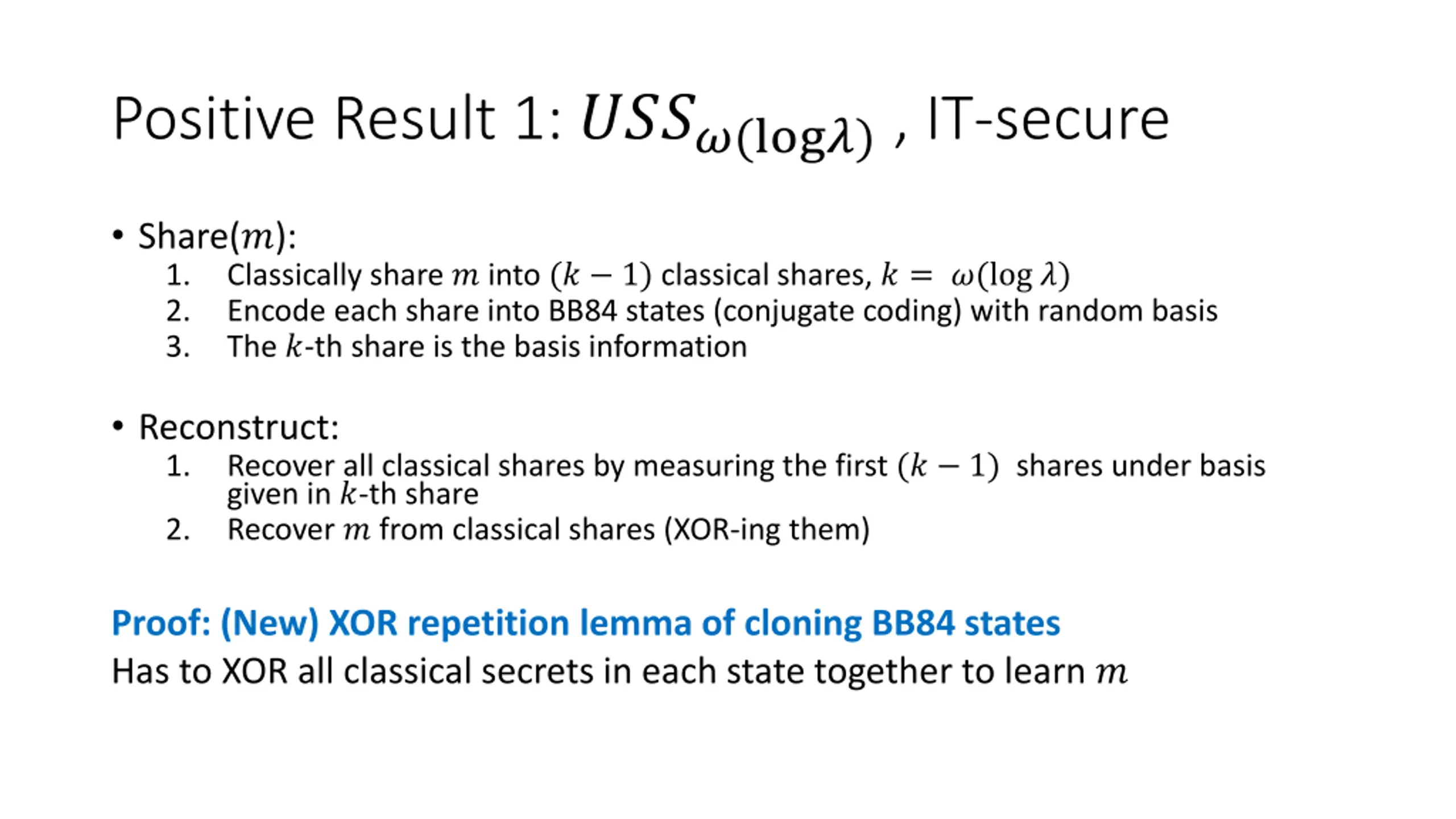 Positive Result 1: ????(log?) , IT-secure Share(?): 1. 2. 3. Classically share ? into (? 1) classical shares, ? = ?(log ?) Encode each share into BB84 states (conjugate coding) with random basis The ?-th share is the basis information Reconstruct: 1. Recover all classical shares by measuring the first (? 1) shares under basis given in ?-th share Recover ? from classical shares (XOR-ing them) 2. Proof: (New) XOR repetition lemma of cloning BB84 states Has to XOR all classical secrets in each state together to learn ?