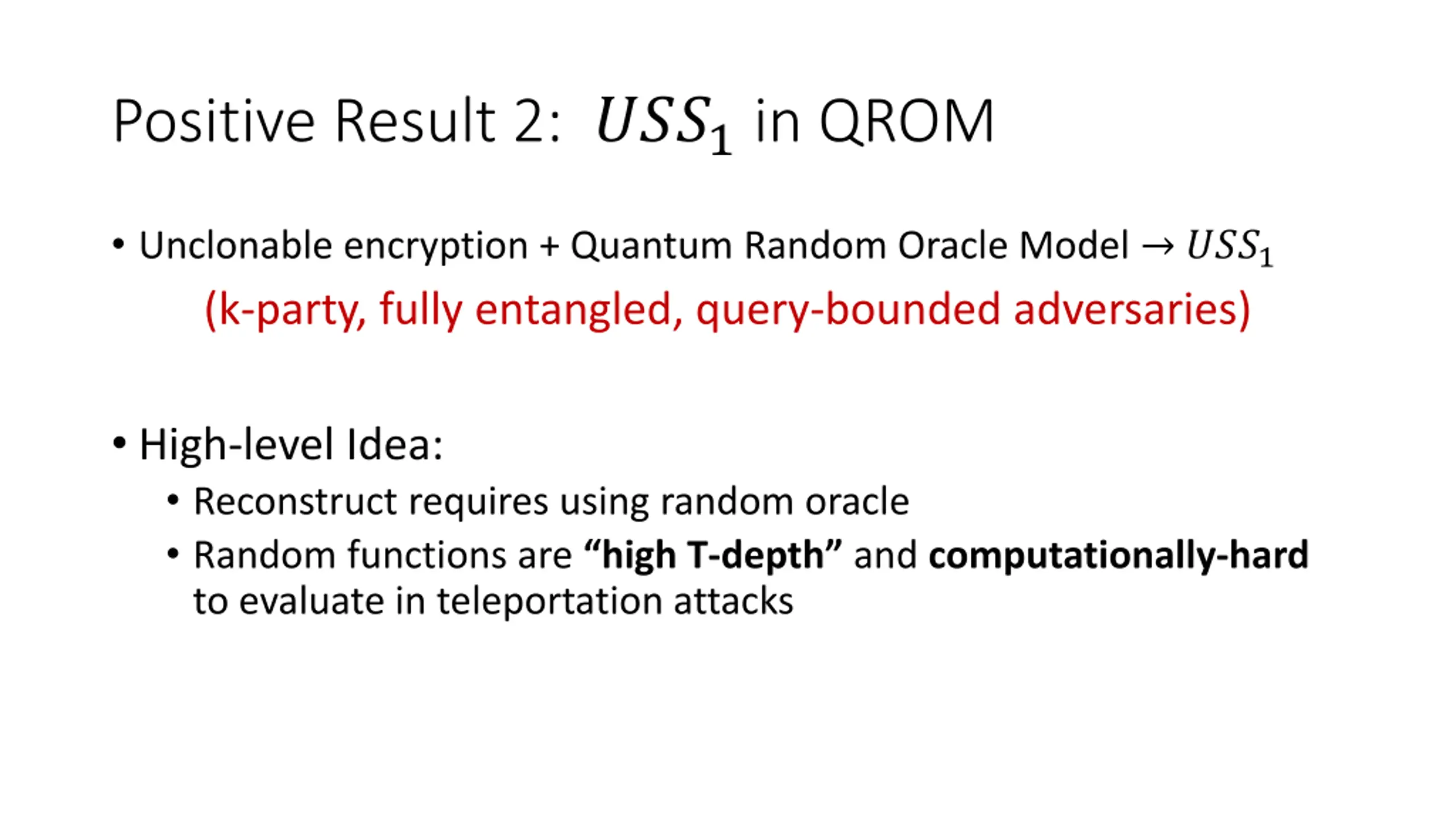 Positive Result 2: ???1 in QROM Unclonable encryption + Quantum Random Oracle Model ???1 (k-party, fully entangled, query-bounded adversaries) High-level Idea: Reconstruct requires using random oracle Random functions are high T-depth and computationally-hard to evaluate in teleportation attacks