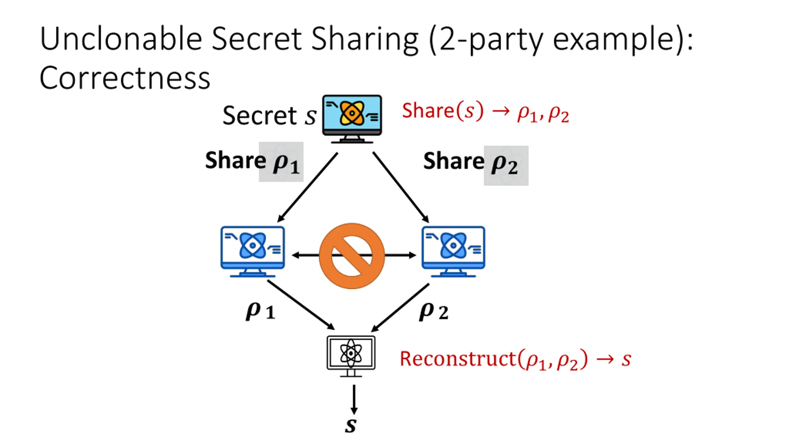 Unclonable Secret Sharing (2-party example): Correctness Secret ? Share ?? Share ? ?1,?2 Share ?? ?? ?? Reconstruct ?1,?2 ? ?