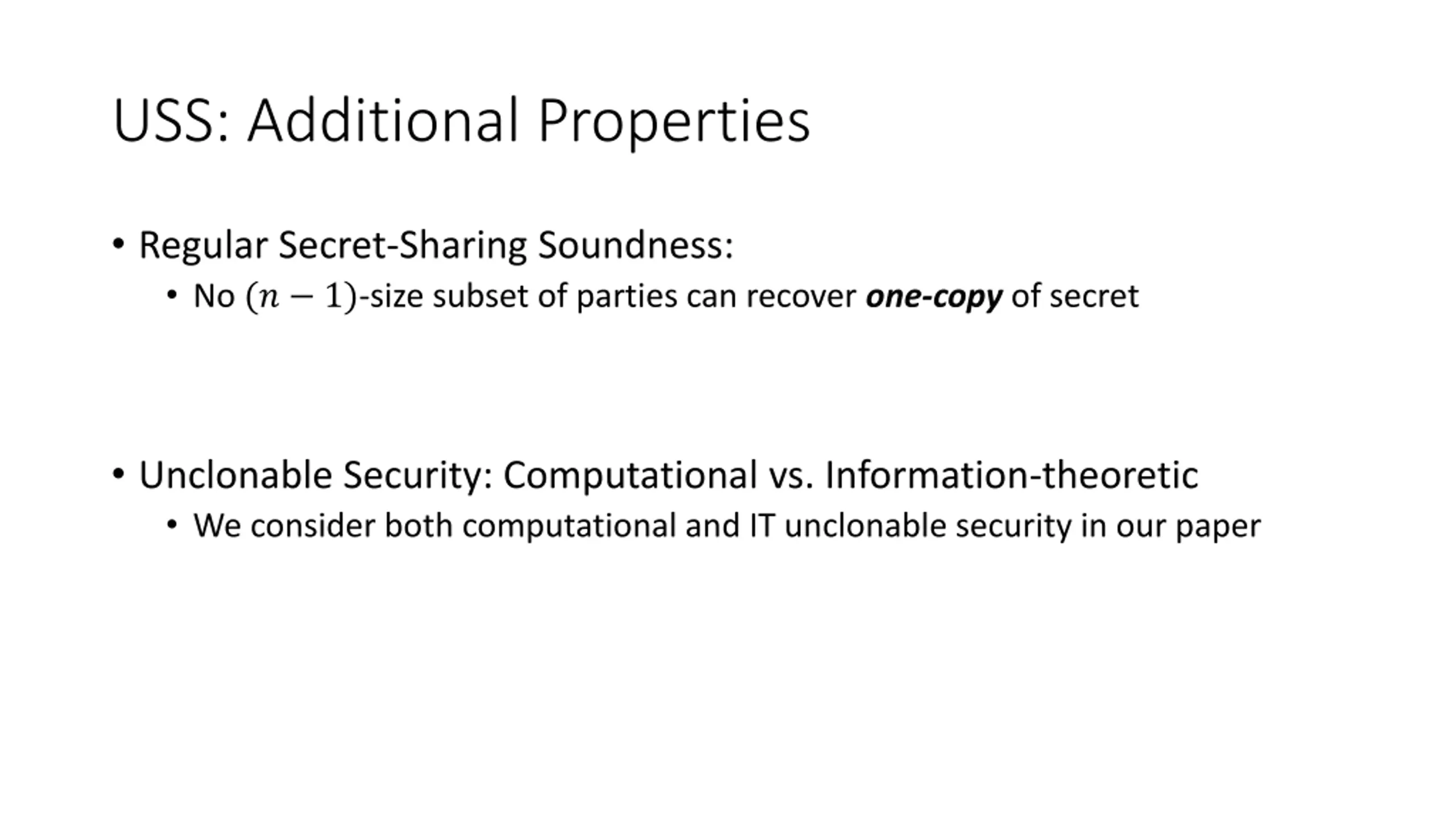 USS: Additional Properties Regular Secret-Sharing Soundness: No (? 1)-size subset of parties can recover one-copy of secret Unclonable Security: Computational vs. Information-theoretic We consider both computational and IT unclonable security in our paper